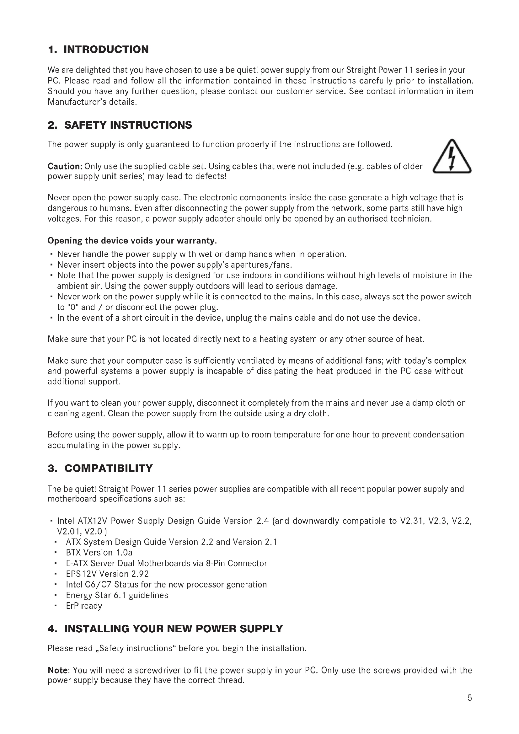 We are delighted that you have chosen to use a be quiet! power supply from our Straight Power 11 series in your PC. Please read and follow all the information contained in these instructions carefully prior to installation. Should you have any further question, please contact our customer service. See contact information in item Manufacturer's details.