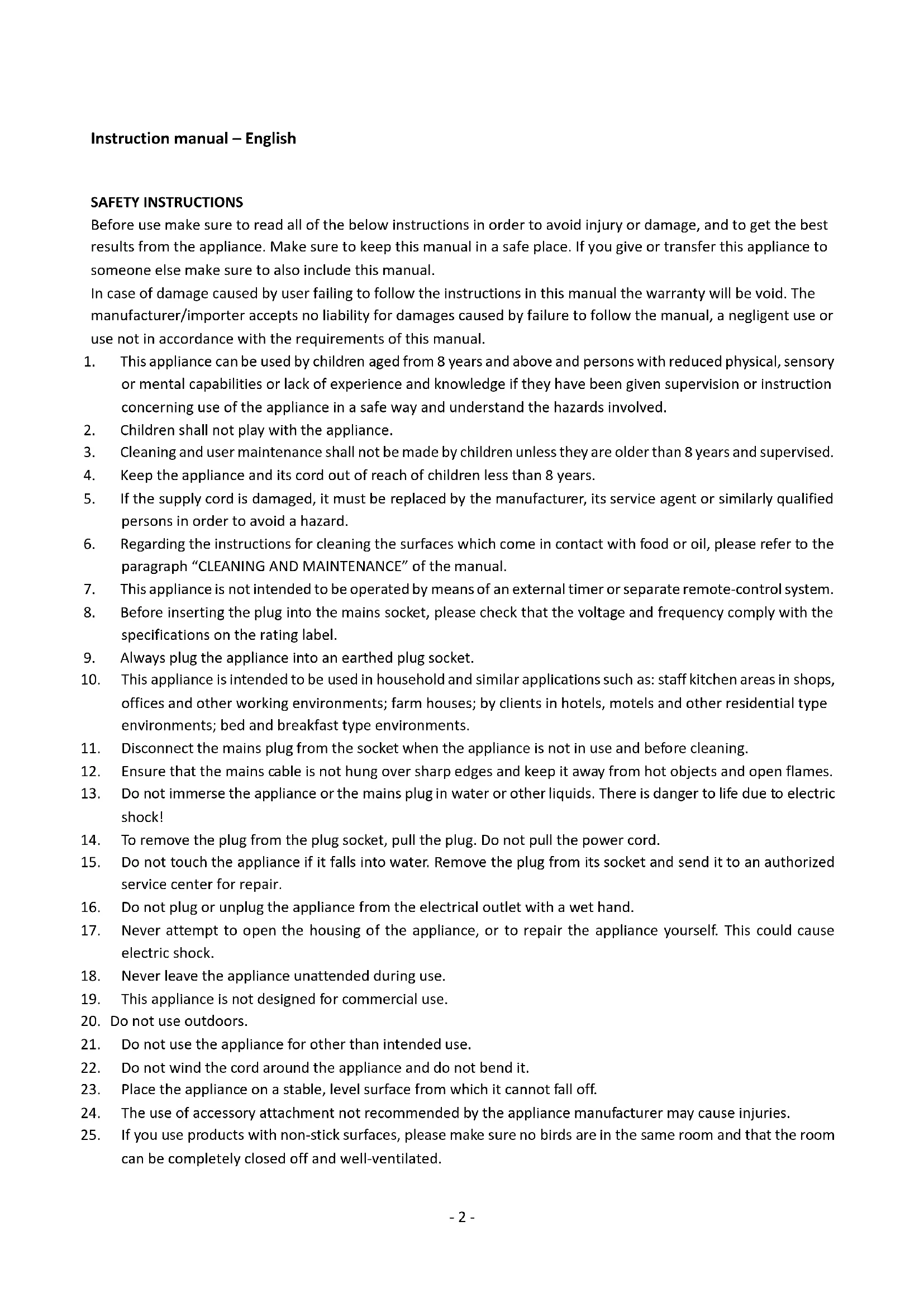 Caution: Do not immerse the appliance in water or other liquids. There is danger to life due to electric shock! TECHNICAL DATA Operating voltage: 220-240V ~ 50-60Hz Power: 750W