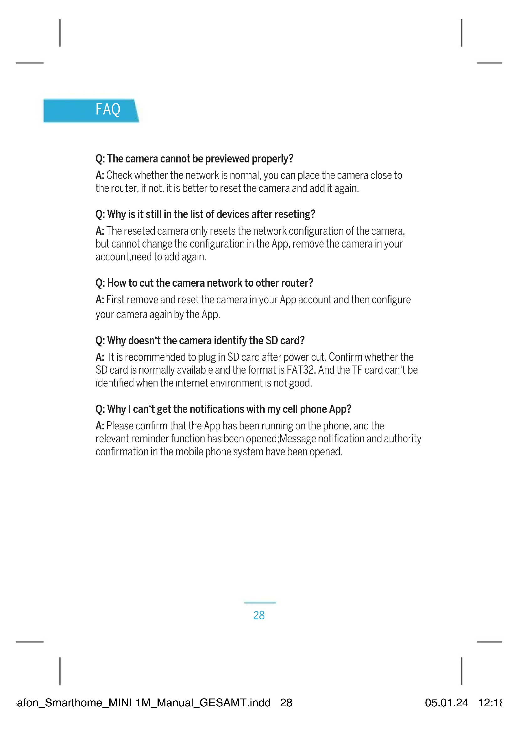 you could also DIY the camera‘s name. beafon_Smarthome_MINI 1M_Manual_GESAMT.indd 26beafon_Smarthome_MINI 1M_Manual_GESAMT.indd 26 05.01.24 12:1805.01.24 12:1827 Settings In „Mini 1M“ interface,click „ „,you can set the camera common functions. beafon_Smarthome_MINI 1M_Manual_GESAMT.indd 27beafon_Smarthome_MINI 1M_Manual_GESAMT.indd 27 05.01.24 12:1805.01.24 12:1828 FAQ Q: The camera cannot be previewed properly? A: Check whether the network is normal, you can place the camera close to the router, if not, it is better to reset the camera and add it again. Q: Why is it still in the list of devices after reseting? A: The reseted camera only resets the network configuration of the camera, but cannot change the configuration in the App, remove the camera in your account,need to add again. Q: How to cut the camera network to other router? A: First remove and reset the camera in your App account and then configure your camera again by the App. Q: Why doesn‘t the camera identify the SD card? A: It is recommended to plug in SD card after power cut. Confirm whether the SD card is normally available and the format is FAT32. And the TF card can‘t be identified when the internet environment is not good. Q: Why I can‘t get the notifications with my cell phone App? A: Please confirm that the App has been running on the phone, and the relevant reminder function has been opened;Message notification and authority confirmation in the mobile phone system have been opened. beafon_Smarthome_MINI 1M_Manual_GESAMT.indd 28beafon_Smarthome_MINI 1M_Manual_GESAMT.indd 28 05.01.24 12:1805.01.24 12:1829 Functions Video flip Flip your video stream vertically anytime for maximum flexibility. Motion detection Motion sensors will notify you when movement is detected. Record Record every moment using high capacity SD card storage or Cloud Storage. Day & Night Powerful night vision means no interruptions, even in complete darkness. Day Night beafon_Smarthome_MINI 1M_Manual_GESAMT.indd 29beafon_Smarthome_MINI 1M_Manual_GESAMT.indd 29 05.01.24 12:1805.01.24 12:1830 General safety instructions Read the instructions before using for the first time!