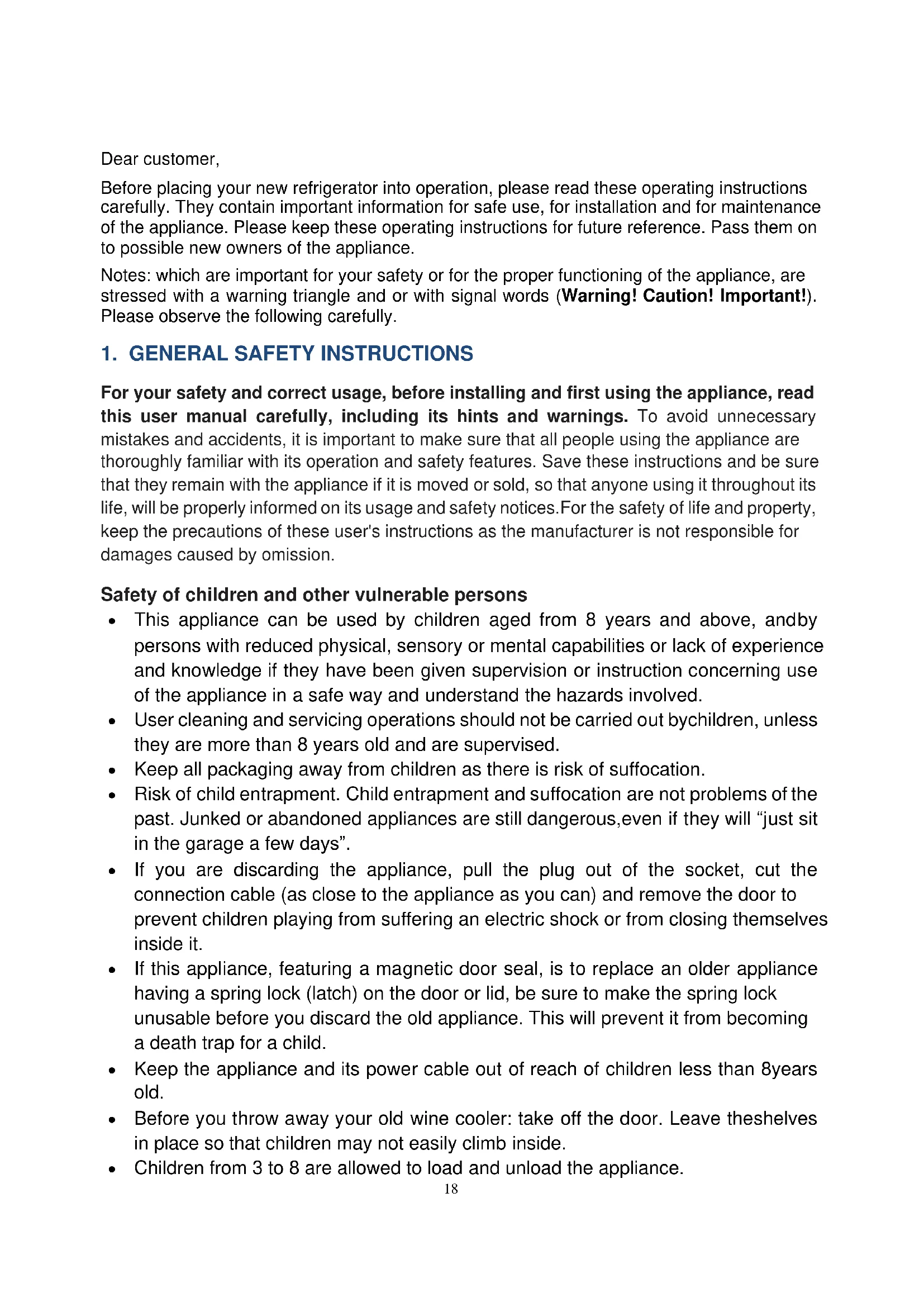 For your safety and correct usage, before installing and first using the appliance, read this user manual carefully, including its hints and warnings. To avoid unnecessary mistakes and accidents, it is important to make sure that all people using the appliance are thoroughly familiar with its operation and safety features. Save these instructions and be sure that they remain with the appliance if it is moved or sold, so that anyone using it throughout its life, will be properly informed on its usage and safety notices. For the safety of life and property, keep the precautions of these user's instructions as the manufacturer is not responsible for damages caused by omission. Safety of children and other vulnerable persons