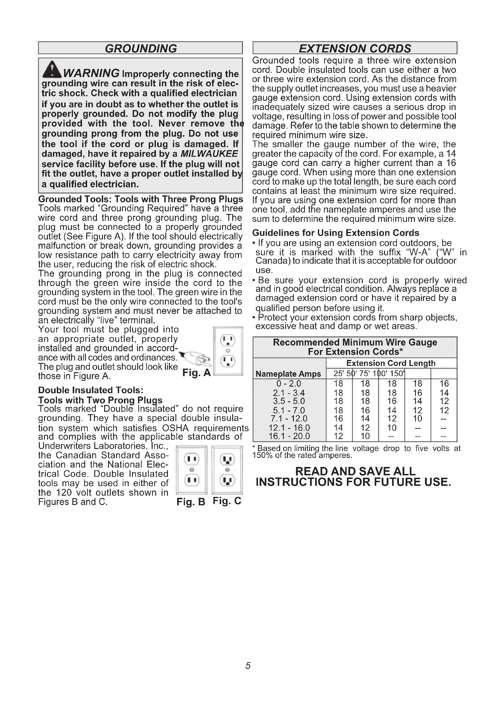 Plunge base models D-Handle models5 Fig. B Fig. C Fig. A grounding Warning Improperly connecting the grounding wire can result in the risk of elec- tric shock. Check with a qualied electrician if you are in doubt as to whether the outlet is properly grounded. Do not modify the plug provided with the tool. Never remove the grounding prong from the plug. Do not use the tool if the cord or plug is damaged. If damaged, have it repaired by a milWaukee service facility before use. If the plug will not t the outlet, have a proper outlet installed by a qualied electrician. Grounded Tools: Tools with Three Prong Plugs Tools marked “Grounding Required” have a three wire cord and three prong grounding plug. The plug must be connected to a properly grounded outlet (See Figure A). If the tool should electrically malfunction or break down, grounding provides a low resistance path to carry electricity away from the user, reducing the risk of electric shock. The grounding prong in the plug is connected through the green wire inside the cord to the grounding system in the tool. The green wire in the cord must be the only wire connected to the tool's grounding system and must never be attached to an electrically “live” terminal. Your tool must be plugged into an appropriate outlet, properly installed and grounded in accord- ance with all codes and ordinances. The plug and outlet should look like those in Figure A. Double Insulated Tools: Tools with Two Prong Plugs Tools marked “Double Insulated” do not require grounding. They have a special double insula- tion system which satises OSHA requirements and complies with the applicable standards of Underwriters Laboratories, Inc., the Canadian Standard Asso- ciation and the National Elec- trical Code. Double Insulated tools may be used in either of the 120 volt outlets shown in Figures B and C. Grounded tools require a three wire extension cord. Double insulated tools can use either a two or three wire extension cord. As the distance from the supply outlet increases, you must use a heavier gauge extension cord. Using extension cords with inadequately sized wire causes a serious drop in voltage, resulting in loss of power and possible tool damage. Refer to the table shown to determine the required minimum wire size. The smaller the gauge number of the wire, the greater the capacity of the cord. For example, a 14 gauge cord can carry a higher current than a 16 gauge cord. When using more than one extension cord to make up the total length, be sure each cord contains at least the minimum wire size required. If you are using one extension cord for more than one tool, add the nameplate amperes and use the sum to determine the required minimum wire size. Guidelines for Using Extension Cords