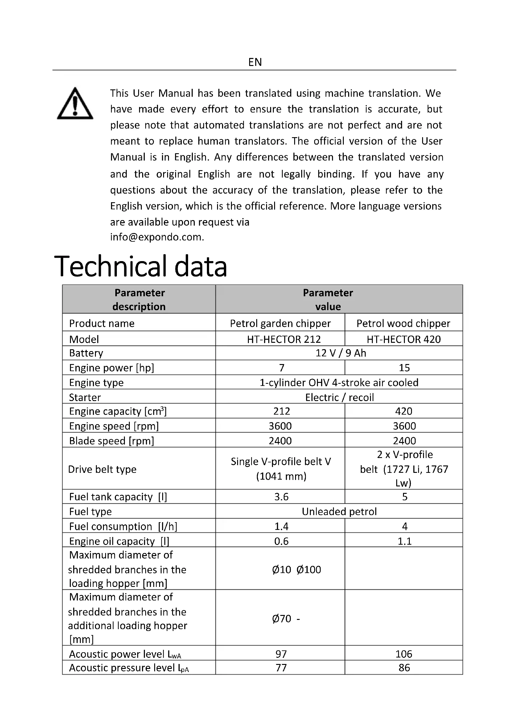 This User Manual has been translated using machine translation. We have made every effort to ensure the translation is accurate, but please note that automated translations are not perfect and are not meant to replace human translators. The official version of the User Manual is in English. Any differences between the translated version and the original English are not legally binding. If you have any questions about the accuracy of the translation, please refer to the English version, which is the official reference. More language versions are available upon request via info@expondo.com. Technical data Parameter description Parameter value Product name Petrol garden chipper Petrol wood chipper Model HT-HECTOR 212 HT-HECTOR 420 Battery 12 V / 9 Ah Engine power [hp]