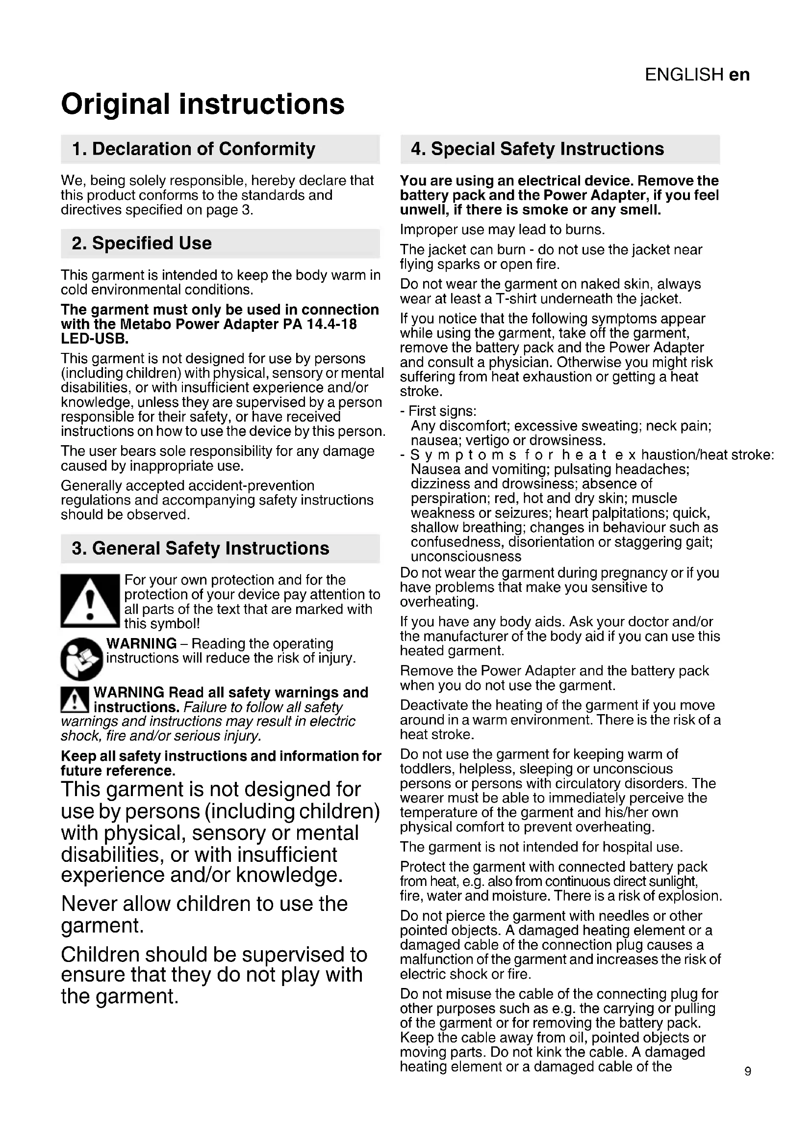 Original instructions We, being solely responsible, hereby declare that this product conforms to the standards and directives specified on page 3. This garment is intended to keep the body warm in cold environmental conditions. The garment must only be used in connection with the Metabo Power Adapter PA 14.4-18 LED-USB. This garment is not designed for use by persons (including children) with physical, sensory or mental disabilities, or with insufficient experience and/or knowledge, unless they are supervised by a person responsible for their safety, or have received instructions on how to use the device by this person. The user bears sole responsibility for any damage caused by inappropriate use. Generally accepted accident-prevention regulations and accompanying safety instructions should be observed. For your own protection and for the protection of your device pay attention to all parts of the text that are marked with this symbol! WARNING – Reading the operating instructions will reduce the risk of injury. WARNING Read all safety warnings and instructions. Failure to follow all safety warnings and instructions may result in electric shock, fire and/or serious injury. Keep all safety instructions and information for future reference. This garment is not designed for use by persons (including children) with physical, sensory or mental disabilities, or with insufficient experience and/or knowledge. Never allow children to use the garment. Children should be supervised to ensure that they do not play with the garment. You are using an electrical device. Remove the battery pack and the Power Adapter, if you feel unwell, if there is smoke or any smell. Improper use may lead to burns. The jacket can burn - do not use the jacket near flying sparks or open fire. Do not wear the garment on naked skin, always wear at least a T-shirt underneath the jacket. If you notice that the following symptoms appear while using the garment, take off the garment, remove the battery pack and the Power Adapter and consult a physician. Otherwise you might risk suffering from heat exhaustion or getting a heat stroke. - First signs: Any discomfort; excessive sweating; neck pain; nausea; vertigo or drowsiness. -Symptoms for heat exhaustion/heat stroke: Nausea and vomiting; pulsating headaches; dizziness and drowsiness; absence of perspiration; red, hot and dry skin; muscle weakness or seizures; heart palpitations; quick, shallow breathing; changes in behaviour such as confusedness, disorientation or staggering gait; unconsciousness Do not wear the garment during pregnancy or if you have problems that make you sensitive to overheating. If you have any body aids. Ask your doctor and/or the manufacturer of the body aid if you can use this heated garment. Remove the Power Adapter and the battery pack when you do not use the garment. Deactivate the heating of the garment if you move around in a warm environment. There is the risk of a heat stroke. Do not use the garment for keeping warm of toddlers, helpless, sleeping or unconscious persons or persons with circulatory disorders. The wearer must be able to immediately perceive the temperature of the garment and his/her own physical comfort to prevent overheating. The garment is not intended for hospital use. Protect the garment with connected battery pack from heat, e.g. also from continuous direct sunlight, fire, water and moisture. There is a risk of explosion. Do not pierce the garment with needles or other pointed objects. A damaged heating element or a damaged cable of the connection plug causes a malfunction of the garment and increases the risk of electric shock or fire. Do not misuse the cable of the connecting plug for other purposes such as e.g. the carrying or pulling of the garment or for removing the battery pack. Keep the cable away from oil, pointed objects or moving parts. Do not kink the cable. A damaged heating element or a damaged cable of the