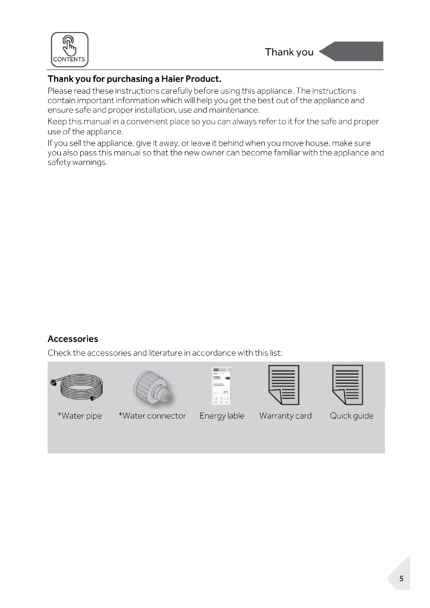 *Water pipe *Water connector Energy lable Warranty card Quick guide6 Safety information CONTENTS Safety information