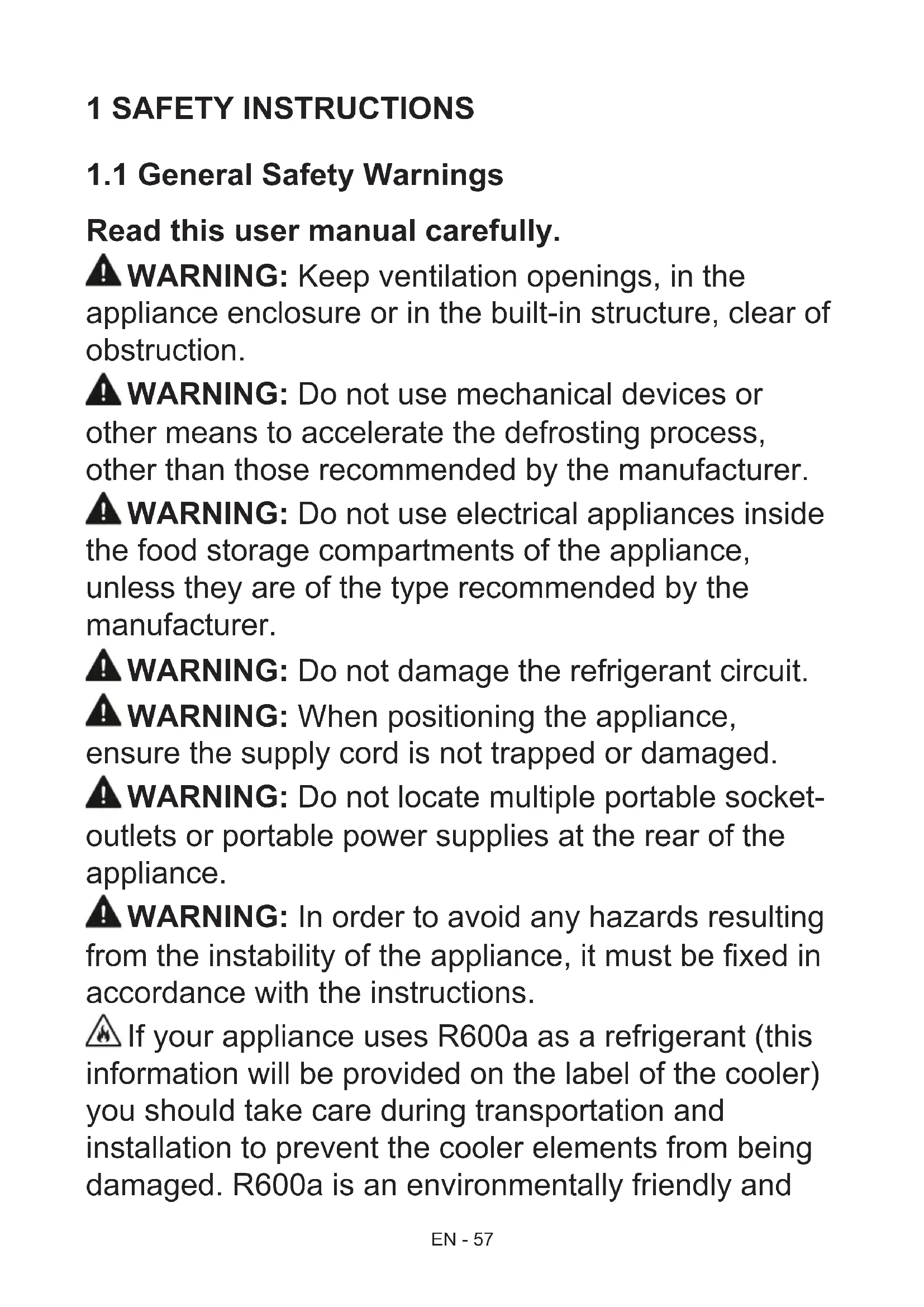 from the instability of the appliance, it must be xed in accordance with the instructions. If your appliance uses R600a as a refrigerant (this information will be provided on the label of the cooler) you should take care during transportation and installation to prevent the cooler elements from being damaged. R600a is an environmentally friendly andEN - 58 natural gas, but it is explosive. In the event of a leak due to damage of the cooler elements, move your fridge away from open ames or heat sources and ventilate the room where the appliance is located for a few minutes.