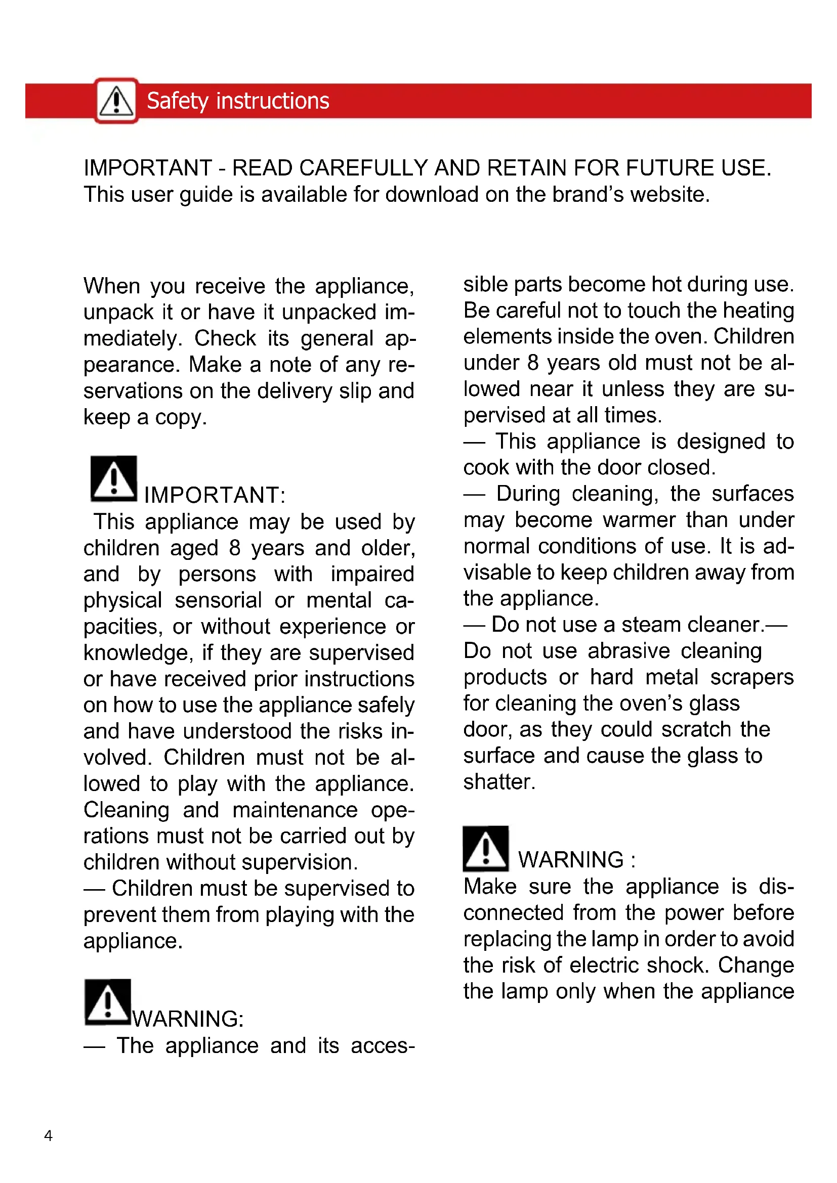 Make sure the appliance is dis- connected from the power before replacing the lamp in order to avoid the risk of electric shock. Change the lamp only when the appliance IMPORTANT - READ CAREFULLY AND RETAIN FOR FUTURE USE. This user guide is available for download on the brand’s website.5 Safety instructions Safety instructions has cooled down. To unscrew the view port and the light, use a rub