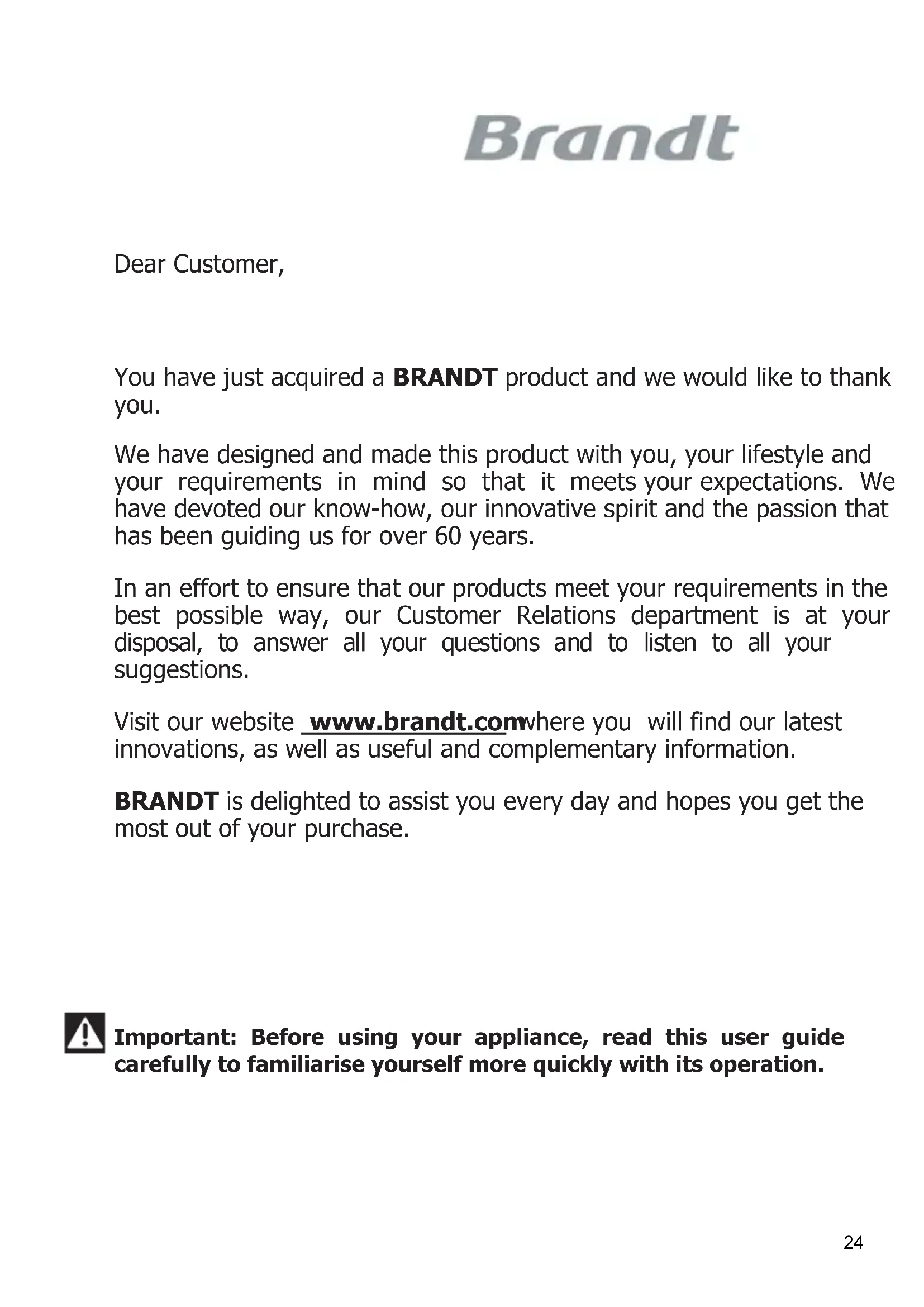 POR PERSONAL AUTORIZADO. Guarde el Certificado de Garantía o la ficha de datos técnicos junto con el Manual de Instrucciones durante la vida del aparato. Contiene datos técnicos importantes. 23Dear Customer, You have just acquired a BRANDT product and we would like to thank you. We have designed and made this product with you, your lifestyle and your requirements in mind so that it meets your expectations. We have devoted our know-how, our innovative spirit and the passion that has been guiding us for over 60 years. In an effort to ensure that our products meet your requirements in the best possible way, our Customer Relations department is at your disposal, to answer all your questions and to listen to all your suggestions. Visit our website www.brandt.com where you will find our latest innovations, as well as useful and complementary information. BRANDT is delighted to assist you every day and hopes you get the most out of your purchase. Important: Before using your appliance, read this user guide carefully to familiarise yourself more quickly with its operation. 24INDEX: Pag.