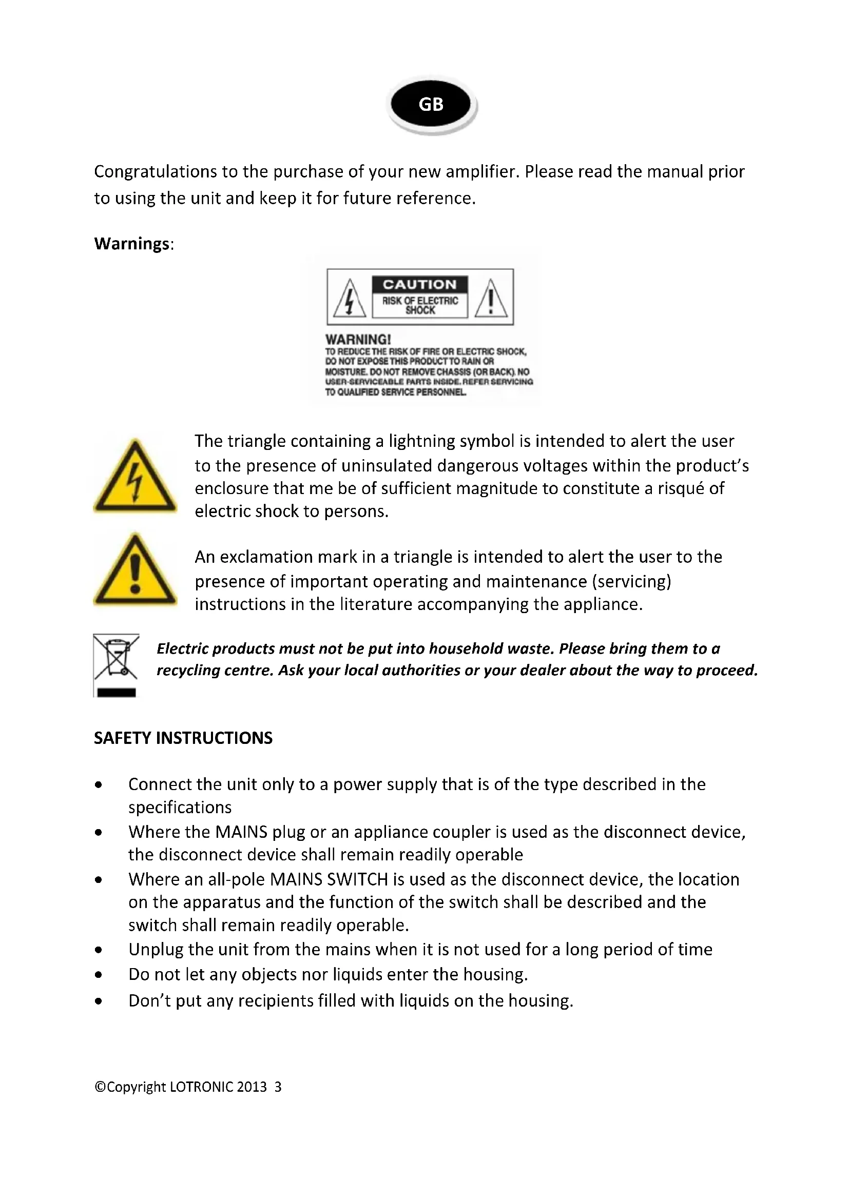The triangle containing a lightning symbol is intended to alert the user to the presence of uninsulated dangerous voltages within the product’s enclosure that me be of sufficient magnitude to constitute a risqué of electric shock to persons. An exclamation mark in a triangle is intended to alert the user to the presence of important operating and maintenance (servicing) instructions in the literature accompanying the appliance. Electric products must not be put into household waste. Please bring them to a recycling centre. Ask your local authorities or your dealer about the way to proceed. SAFETY INSTRUCTIONS