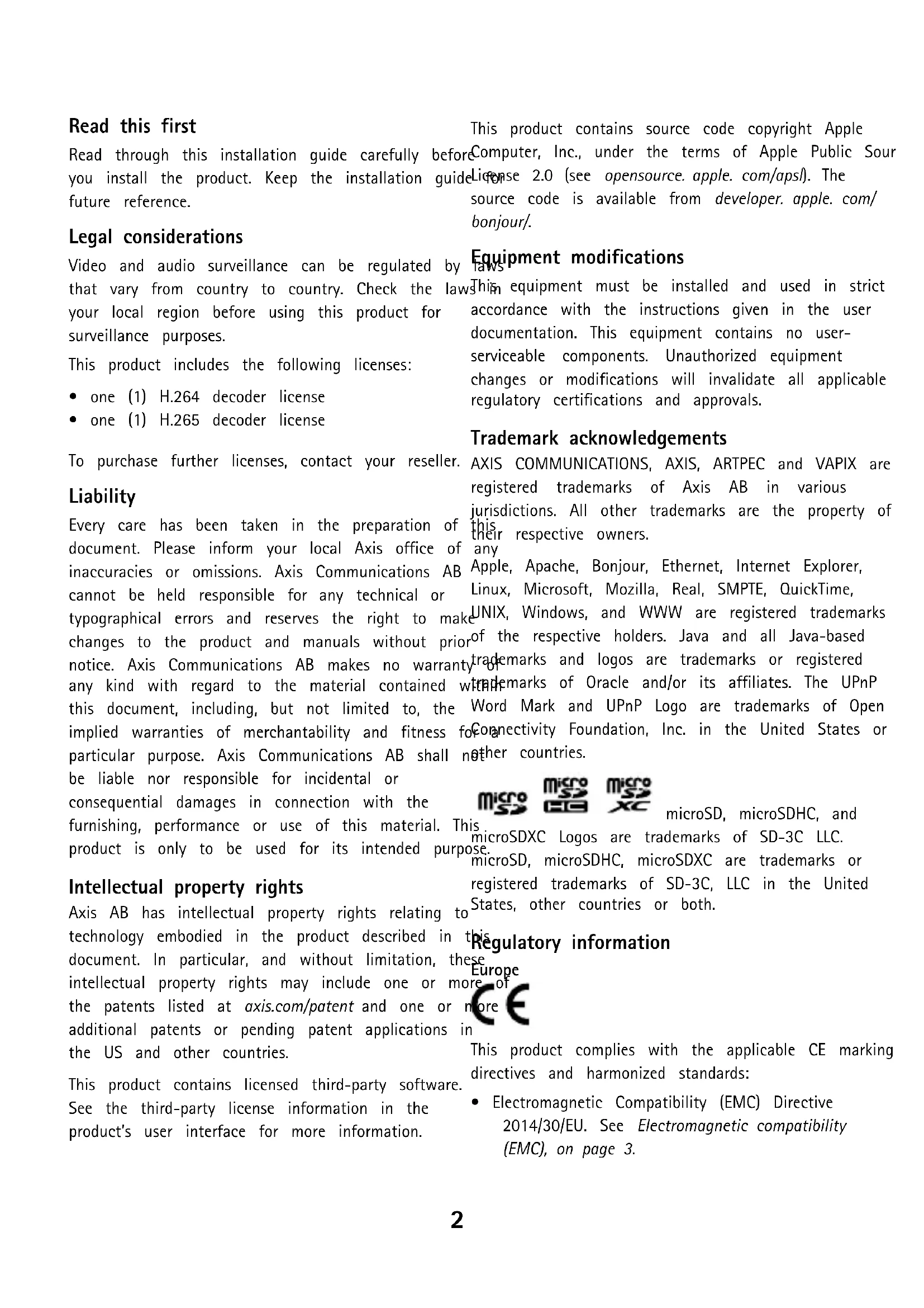 - one (1) H.265 decoder license To purchase further licenses, contact your reseller. Liability Every care has been taken in the preparation of this document. Please inform your local Axis office of any inaccuracies or omissions. Axis Communications AB cannot be held responsible for any technical or typographical errors and reserves the right to make changes to the product and manuals without prior notice. Axis Communications AB makes no warranty of any kind with regard to the material contained within this document, including, but not limited to, the implied warranties of merchantability and fitness for a particular purpose. Axis Communications AB shall not be liable nor responsible for incidental or consequential damages in connection with the furnishing, performance or use of this material. This product is only to be used for its intended purpose. Intellectual property rights Axis AB has intellectual property rights relating to technology embodied in the product described in this document. In particular, and without limitation, these intellectual property rights may include one or more of the patents listed at axis.com/patent and one or more additional patents or pending patent applications in the US and other countries. This product contains licensed third-party software. See the third-party license information in the product’s user interface for more information. This product contains source code copyright Apple Computer, Inc., under the terms of Apple Public Source License 2.0 (see opensource. apple. com/apsl). The source code is available from developer. apple. com/ bonjour/. Equipment modifications This equipment must be installed and used in strict accordance with the instructions given in the user documentation. This equipment contains no user- serviceable components. Unauthorized equipment changes or modifications will invalidate all applicable regulatory certifications and approvals. Trademark acknowledgements AXIS COMMUNICATIONS, AXIS, ARTPEC and VAPIX are registered trademarks of Axis AB in various jurisdictions. All other trademarks are the property of their respective owners. Apple, Apache, Bonjour, Ethernet, Internet Explorer, Linux, Microsoft, Mozilla, Real, SMPTE, QuickTime, UNIX, Windows, and WWW are registered trademarks of the respective holders. Java and all Java-based trademarks and logos are trademarks or registered trademarks of Oracle and/or its affiliates. The UPnP Word Mark and UPnP Logo are trademarks of Open Connectivity Foundation, Inc. in the United States or other countries. microSD, microSDHC, and microSDXC Logos are trademarks of SD-3C LLC. microSD, microSDHC, microSDXC are trademarks or registered trademarks of SD-3C, LLC in the United States, other countries or both. Regulatory information Europe This product complies with the applicable CE marking directives and harmonized standards: