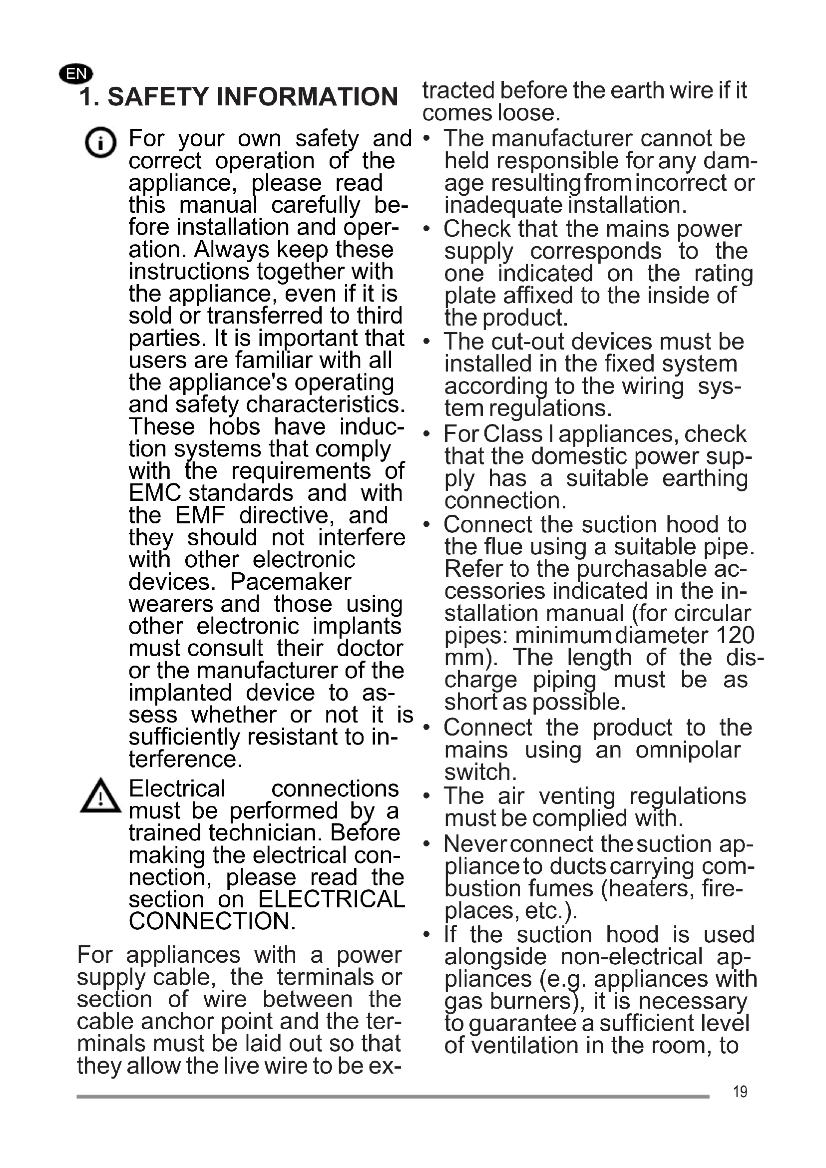 For your own safety and correct operation of the appliance, please read this manual carefully be- fore installation and oper- ation. Always keep these instructions together with the appliance, even if it is sold or transferred to third parties. It is important that users are familiar with all the appliance's operating and safety characteristics. These hobs have induc- tion systems that comply with the requirements of EMC standards and with the EMF directive, and they should not interfere with other electronic devices. Pacemaker wearers and those using other electronic implants must consult their doctor or the manufacturer of the implanted device to as- sess whether or not it is sufficiently resistant to in- terference. Electrical connections must be performed by a trained technician. Before making the electrical con- nection, please read the section on ELECTRICAL CONNECTION. For appliances with a power supply cable, the terminals or section of wire between the cable anchor point and the ter- minals must be laid out so that they allow the live wire to be ex- tracted before the earth wire if it comes loose.