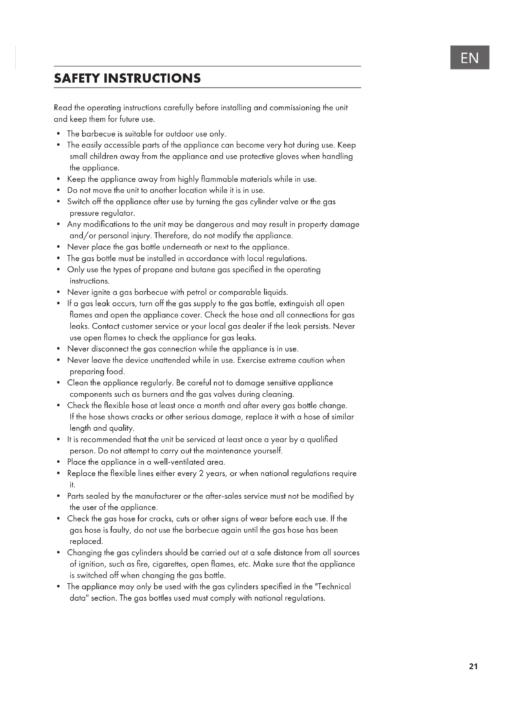 Dear customer, Congratulations on purchasing this device. Please read the following instructions carefully and follow them to prevent possible damages. We assume no liability for damage caused by disregard of the instructions and improper use. Scan the QR code to get access to the latest user manual and more product information. CONTENTS Safety Instructions 21 Gas Connection 23 Leak Test 24 Overview 25 Assembly 27 Getting Started 28 Operation 29 Cleaning and Care 31 Troubleshooting 32 Disposal Considerations 33 Manufacturer & Importer (UK) 33 Assembly Instructions83 TECHNICAL DATA Article number 10045155 Total heat output (Hs) 13.5 kW (982 g/h) Main burner / side burner (number) 3 main burners + 1 side burner Gas category I3B/P(30) I3+(28~30/37) Countries LU, NL, DK, FI, SE, CY, CZ, LT, MT, SK, SI, BG, IS, NO, TR, HR, RO, IT, HU, LV BE, FR, IT, LU, IE, GB, GR, PT, ES, CY, CZ, LT, SK, CH, SI, LV Gas Propane, butane and mixtures Butane/propane Gas pressure 28~30mbar 28~30/37mbar20