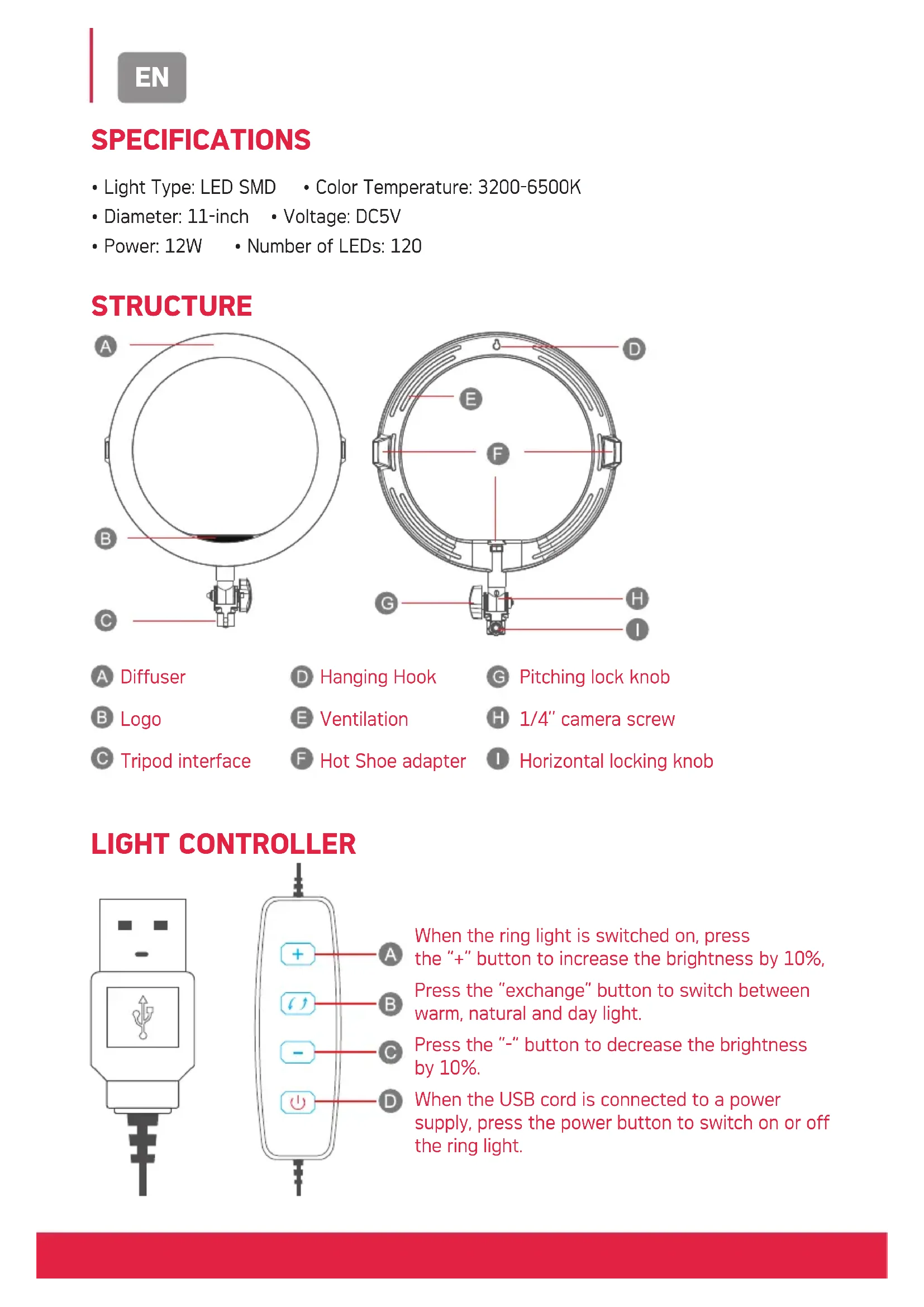 - Power: 12W • Number of LEDs: 120 STRUCTURE LIGHT CONTROLLER Diffuser Logo Tripod interface Hanging Hook Ventilation Hot Shoe adapter When the ring light is switched on, press the “+” button to increase the brightness by 10%, Press the “exchange” button to switch between warm, natural and day light. Press the “-“ button to decrease the brightness by 10%. When the USB cord is connected to a power supply, press the power button to switch on or off the ring light. Pitching lock knob 1/4’’ camera screw Horizontal locking knobEN SPECIFICATIONS
