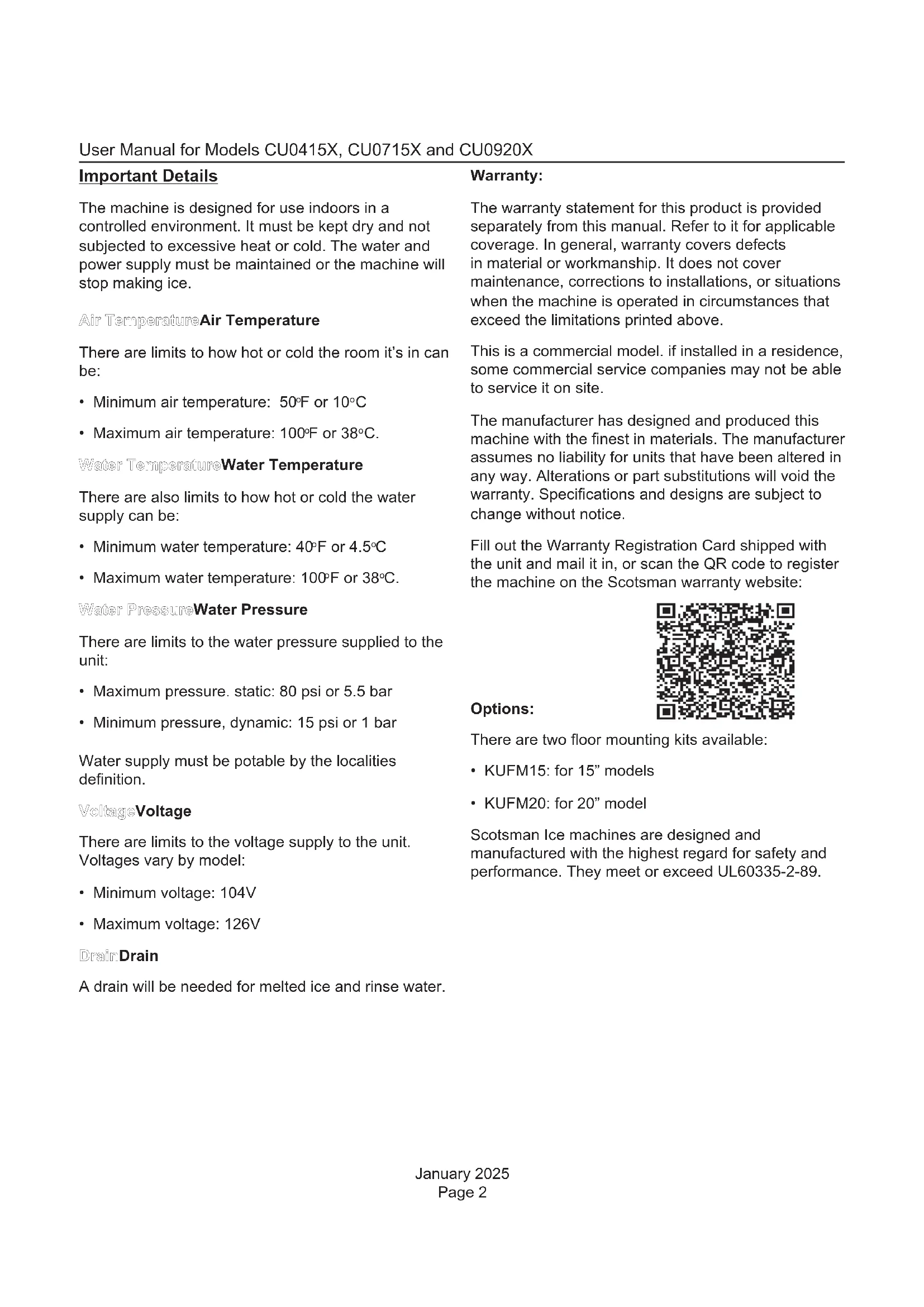 - KUFM20: for 20” model Scotsman Ice machines are designed and manufactured with the highest regard for safety and performance. They meet or exceed UL60335-2-89.January 2025 Page 3 User Manual for Models CU0415X, CU0715X and CU0920X Pre-Installation This appliance is intended to be used in commercial applications including: