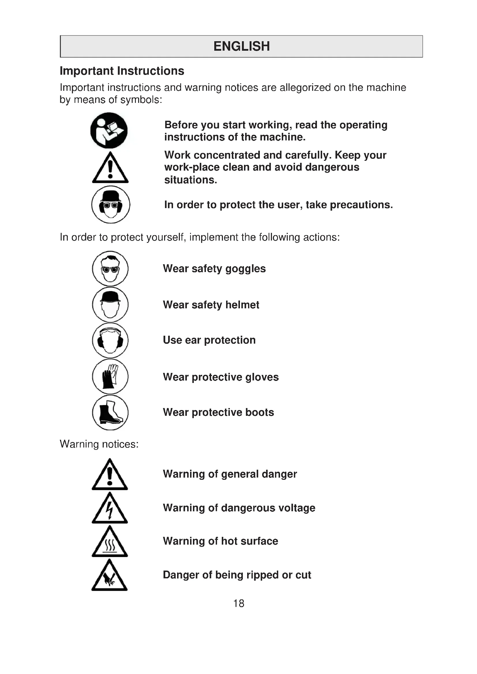 ENGLISH Important Instructions Important instructions and warning notices are allegorized on the machine by means of symbols: