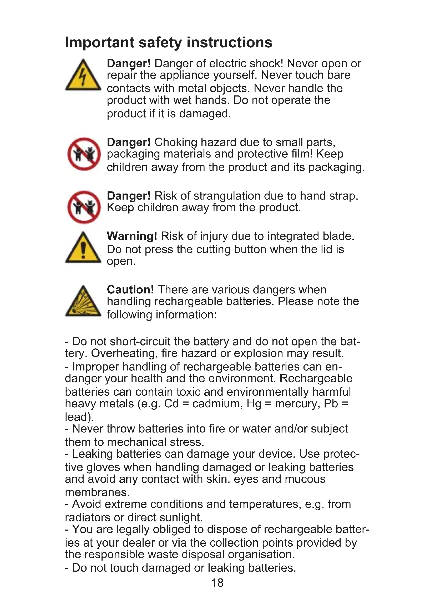 - Manufacturer Important safety instructions Danger! Danger of electric shock! Never open or repair the appliance yourself. Never touch bare contacts with metal objects. Never handle the product with wet hands. Do not operate the product if it is damaged. Danger! Choking hazard due to small parts, packaging materials and protective lm! Keep children away from the product and its packaging. Danger! Risk of strangulation due to hand strap. Keep children away from the product. Warning! Risk of injury due to integrated blade. Do not press the cutting button when the lid is open. Caution! There are various dangers when handling rechargeable batteries. Please note the following information: - Do not short-circuit the battery and do not open the bat- tery. Overheating, re hazard or explosion may result. - Improper handling of rechargeable batteries can en- danger your health and the environment. Rechargeable batteries can contain toxic and environmentally harmful heavy metals (e.g. Cd = cadmium, Hg = mercury, Pb = lead). - Never throw batteries into re or water and/or subject them to mechanical stress. - Leaking batteries can damage your device. Use protec- tive gloves when handling damaged or leaking batteries and avoid any contact with skin, eyes and mucous membranes. - Avoid extreme conditions and temperatures, e.g. from radiators or direct sunlight. - You are legally obliged to dispose of rechargeable batter- ies at your dealer or via the collection points provided by the responsible waste disposal organisation. - Do not touch damaged or leaking batteries.19 Caution! Risk of jamming when closing the lid! Caution! Risk of burns due to hot print head! Do not touch the print head directly after operation. Attention! Material damage possible! Use a power supply unit with max. 5 V DC / 1 A for charging. Attention! Attention! Bluetooth can cause interference! Make sure that several Bluetooth devices are not too close to each other. Attention! Material damage possible! Only use label rolls recommended by the manufacturer. Attention! Material damage possible! If the product exhibits unusual characteristics such as noise, odour or smoke, disconnect the power supply immediately or switch o the appliance. Attention! Material damage possible! Do not drop or shake the appliance. Instructions for use Please read these operating instructions before using the device. Keep these operating instructions for future reference. Hand over all documents when passing the device on to third parties. p. 3118