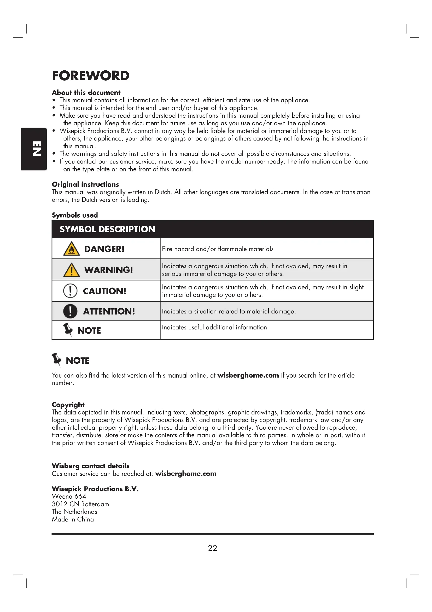 - If you contact our customer service, make sure you have the model number ready. The information can be found on the type plate or on the front of this manual. Original instructions This manual was originally written in Dutch. All other languages are translated documents. In the case of translation errors, the Dutch version is leading. Symbols used SYMBOL DESCRIPTION Fire hazard and/or ammable materials Indicates a dangerous situation which, if not avoided, may result in serious immaterial damage to you or others. Indicates a dangerous situation which, if not avoided, may result in slight immaterial damage to you or others. Indicates a situation related to material damage. Indicates useful additional information. You can also nd the latest version of this manual online, at wisberghome.com if you search for the article number. DANGER! CAUTION! ATTENTION! WARNING! NOTE NOTE Copyright The data depicted in this manual, including texts, photographs, graphic drawings, trademarks, (trade) names and logos, are the property of Wisepick Productions B.V. and are protected by copyright, trademark law and/or any other intellectual property right, unless these data belong to a third party. You are never allowed to reproduce, transfer, distribute, store or make the contents of the manual available to third parties, in whole or in part, without the prior written consent of Wisepick Productions B.V. and/or the third party to whom the data belong. Wisberg contact details Customer service can be reached at: wisberghome.com Wisepick Productions B.V. Weena 664 3012 CN Rotterdam The Netherlands Made in China23
