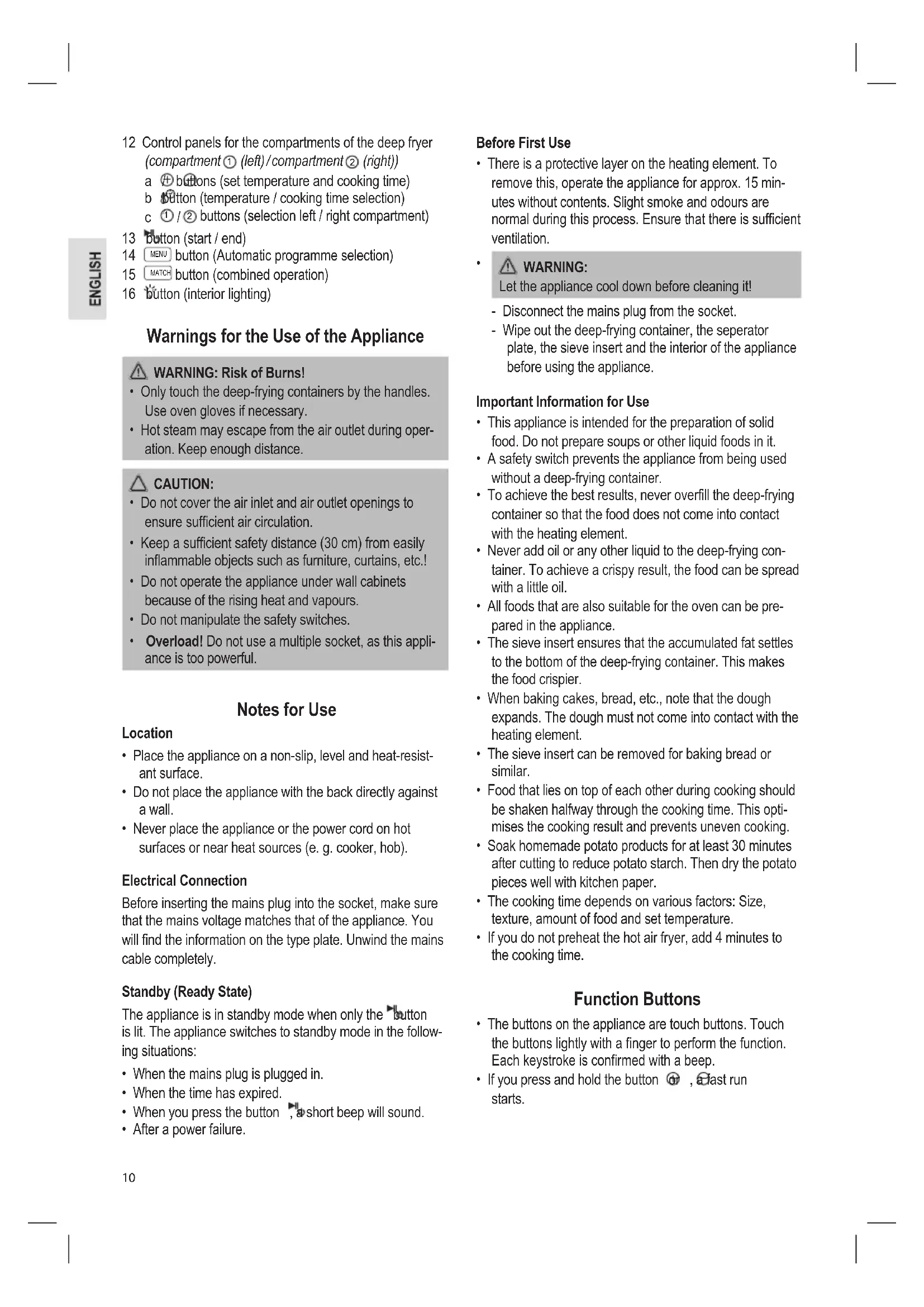 damage can be detected, do not operate the appliance. Return it to the dealer immediately. Scope of Delivery 1× Double hot air deep fryer 1× Sieve insert 1× Frying container 1× Separator plate Overview of the Components Figure A 1 Air outlet openings 2 Air inlet openings 3 Control panel 4 Separator plate 5 Sieve insert 6 Silicone knobs 7 Handle of the deep-frying container 8 Deep-frying container 9 Recessed handle 10 Housing Figure B 11 Indicator light for automatic programmes: FRENCH FRIES (French fries) STEAK (Steak) PIZZA (Pizza) VEGETABLE (Vegetable) CHICKEN (Chicken wings) CAKE (Cake) BACON (Speck) FISH (Fish) SHRIMPS (Shrimps) KEEP WARM (Keep warm)10 12 Control panels for the compartments of the deep fryer (compartment