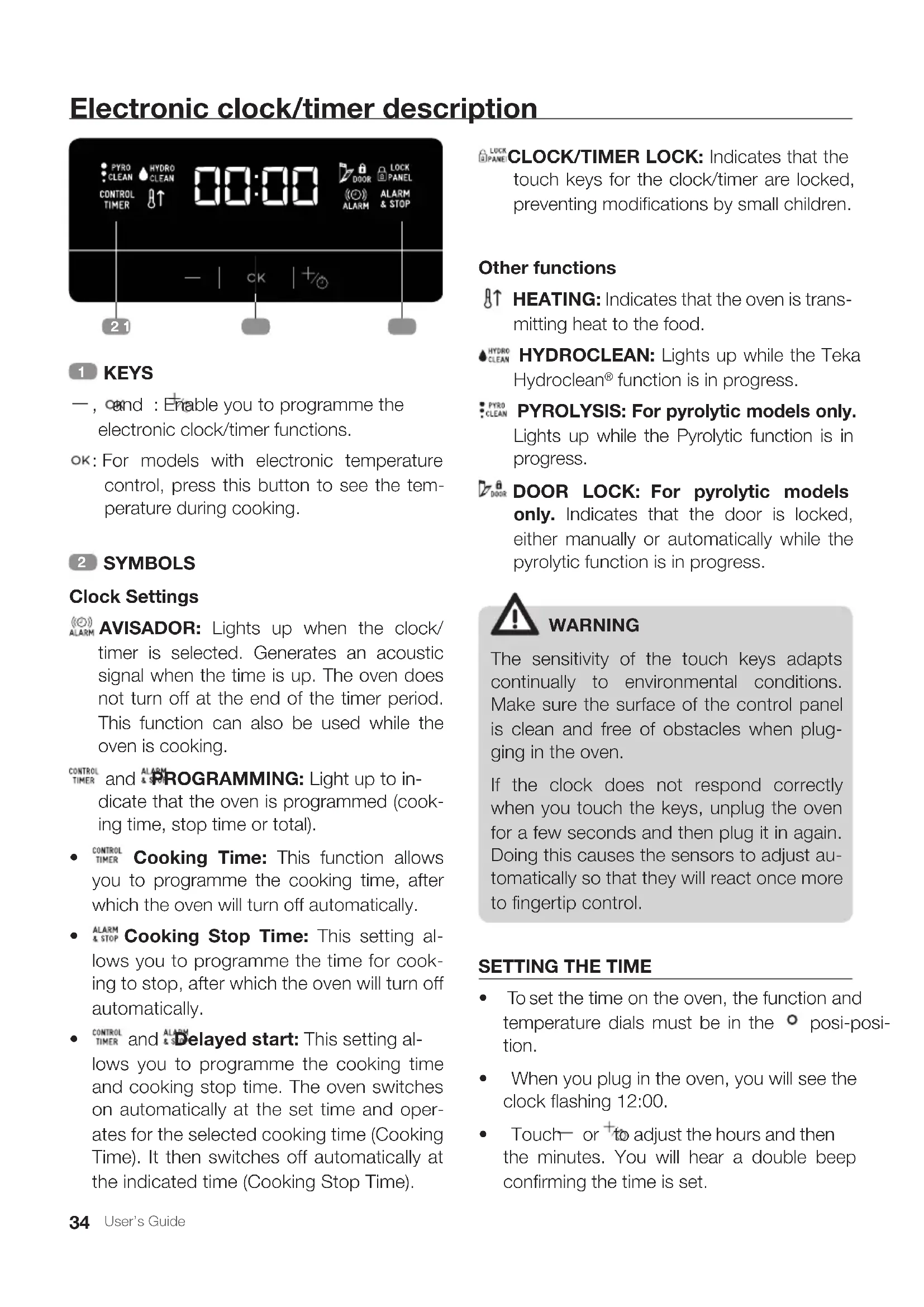 and Delayed start: This setting al- lows you to programme the cooking time and cooking stop time. The oven switches on automatically at the set time and oper- ates for the selected cooking time (Cooking Time). It then switches off automatically at the indicated time (Cooking Stop Time). CLOCK/TIMER LOCK: Indicates that the touch keys for the clock/timer are locked, preventing modifications by small children. Other functions HEATING: Indicates that the oven is trans- mitting heat to the food. HYDROCLEAN: Lights up while the Teka Hydroclean