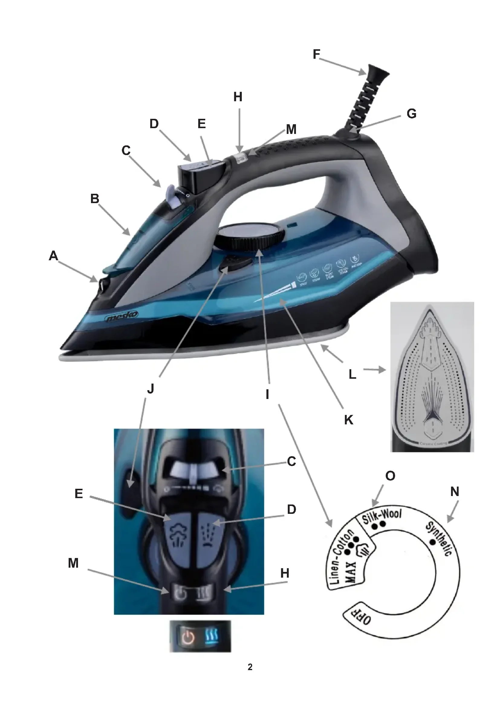 G. Rotary cable gland H. Heating / Thermostat indicator light K. Water tank L. Ceramic coated soleplate O. Silk – Wool fabric – two drops M. Power indicator light N. Synthetic fabric – one drop