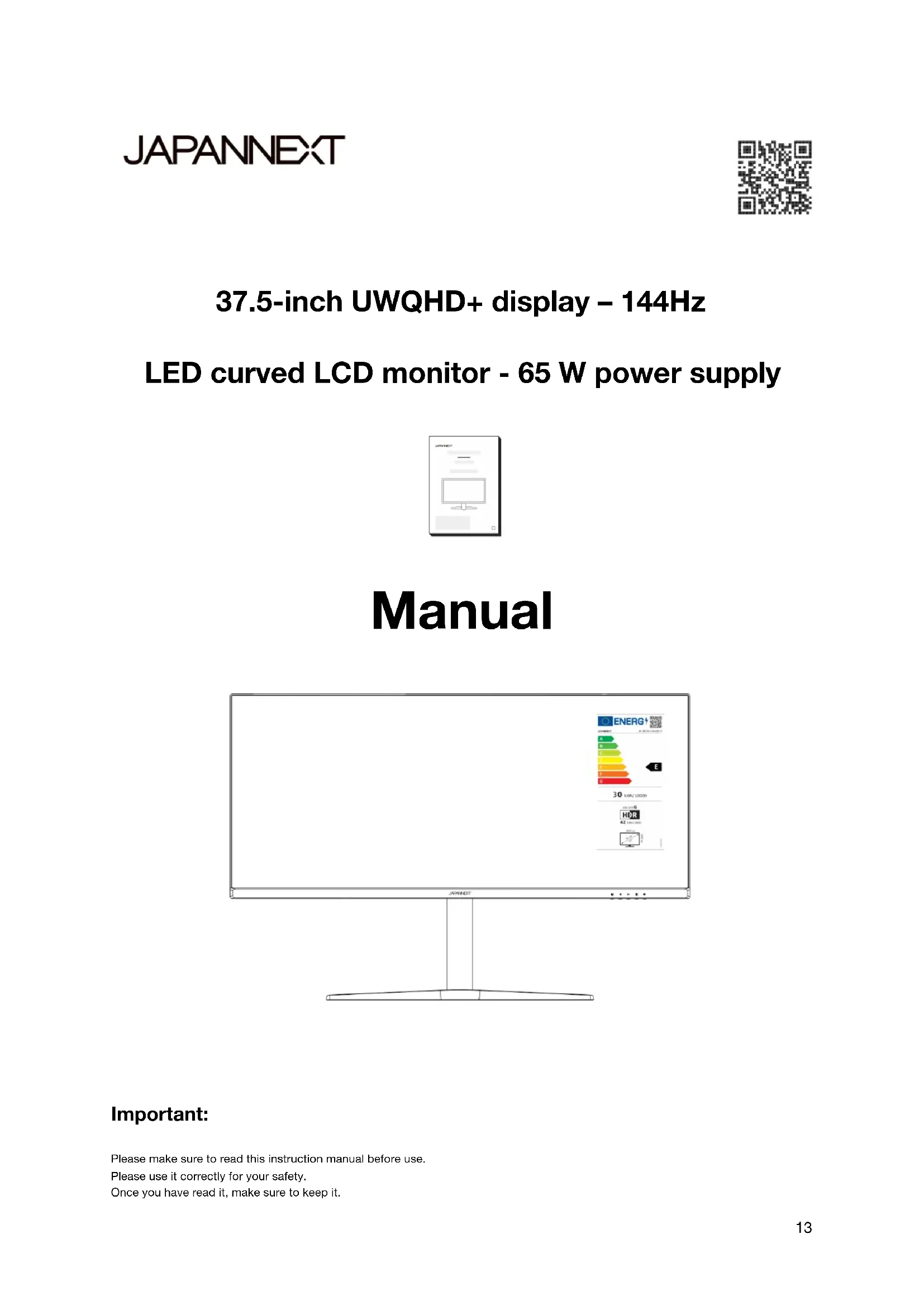 Download the instructions for your Monitor in PDF format for free! Find your manual JNIB375C144UQRH - Japannext and take your electronic device back in hand. On this page are published all the documents necessary for the use of your device. JNIB375C144UQRH by Japannext.