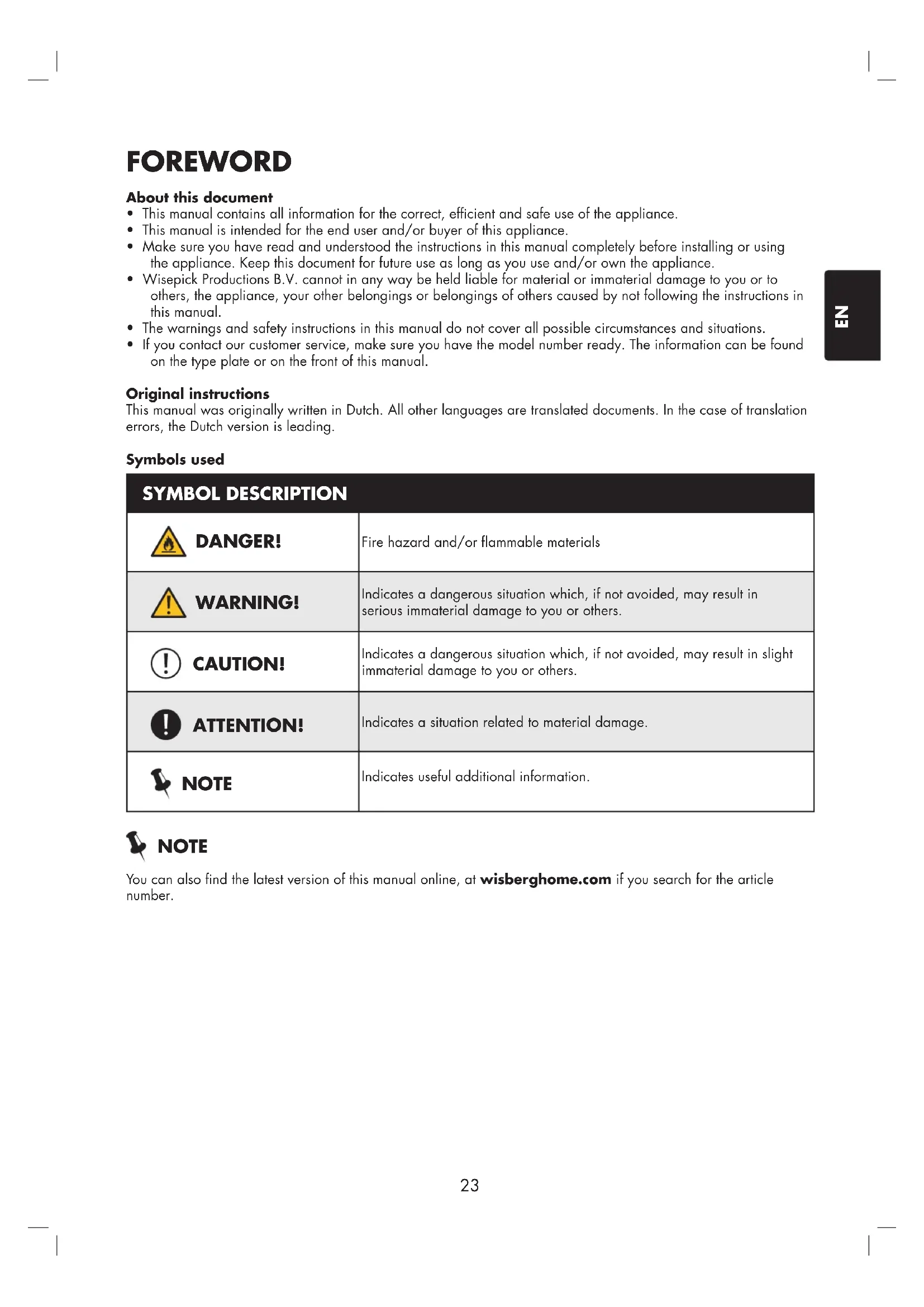 - If you contact our customer service, make sure you have the model number ready. The information can be found on the type plate or on the front of this manual. Original instructions This manual was originally written in Dutch. All other languages are translated documents. In the case of translation errors, the Dutch version is leading. Symbols used SYMBOL DESCRIPTION Fire hazard and/or ammable materials Indicates a dangerous situation which, if not avoided, may result in serious immaterial damage to you or others. Indicates a dangerous situation which, if not avoided, may result in slight immaterial damage to you or others. Indicates a situation related to material damage. Indicates useful additional information. You can also nd the latest version of this manual online, at wisberghome.com if you search for the article number. DANGER! CAUTION! ATTENTION! WARNING! NOTE NOTE24