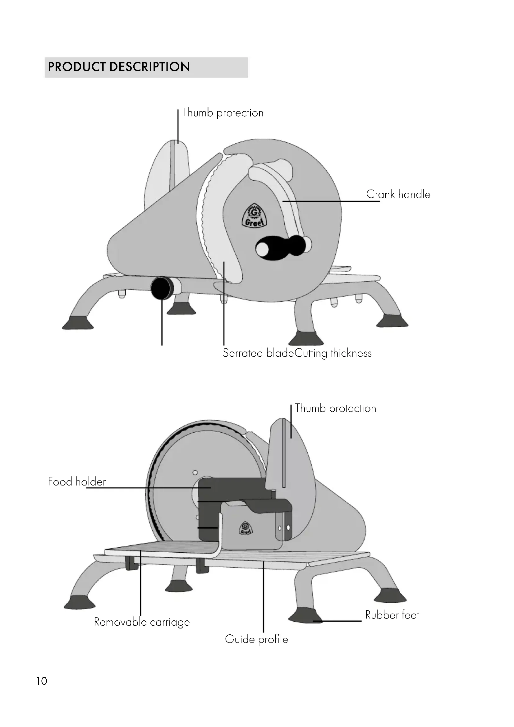- This unit must be used with the car- riage and food holder unless the size and shape of the items to be sliced do not permit its usage.