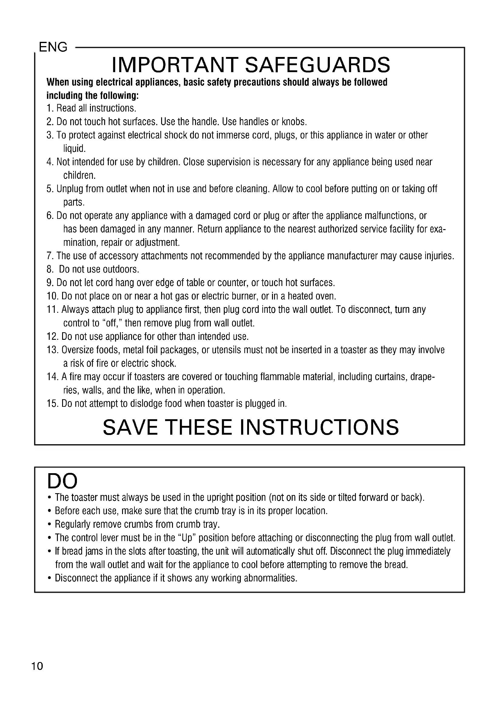 ENG IMPORTANT SAFEGUARDS When using electrical appliances, basic safety precautions should always be followed including the following: