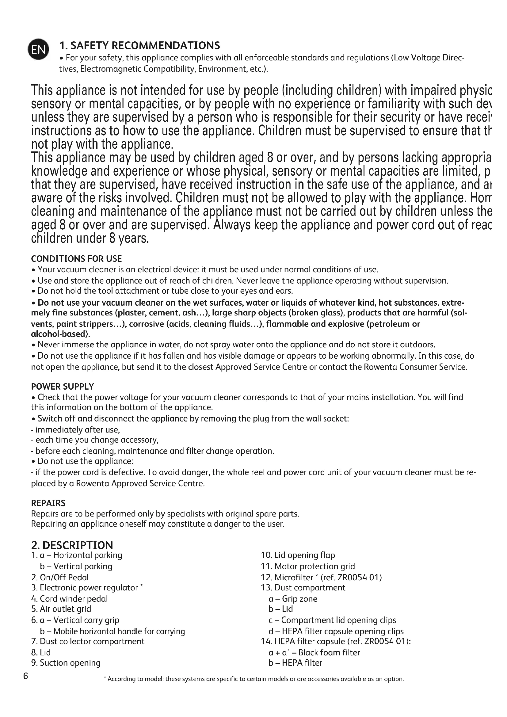 - Do not use the appliance: - if the power cord is defective. To avoid danger, the whole reel and power cord unit of your vacuum cleaner must be re- placed by a Rowenta Approved Service Centre. REPAIRS Repairs are to be performed only by specialists with original spare parts. Repairing an appliance oneself may constitute a danger to the user.