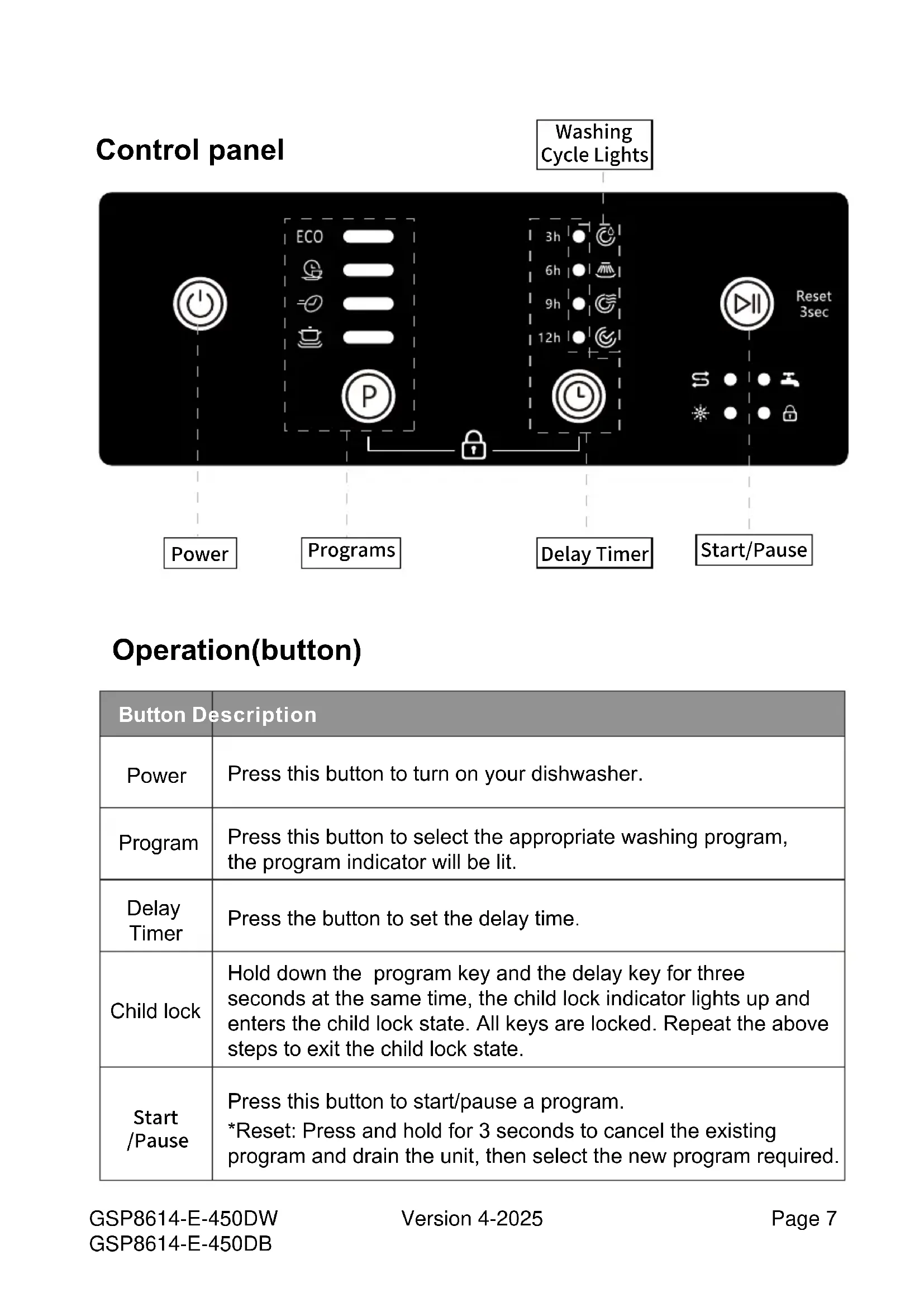 38GSP8614-E-450DW Version 4-2025 Page 1 GSP8614-E-450DBGSP8614-E-450DW Version 4-2025 Page 2 GSP8614-E-450DBGSP8614-E-450DW Version 4-2025 Page 3 GSP8614-E-450DBGSP8614-E-450DW Version 4-2025 Page 4 GSP8614-E-450DBGSP8614-E-450DW Version 4-2025 Page 5 GSP8614-E-450DBGSP8614-E-450DW Version 4-2025 Page 6 GSP8614-E-450DBControl panel Power Programs Delay Timer Washing Cycle Lights Start/Pause Operation(button) Button Description Press this button to turn on your dishwasher. Press the button to set the delay time. Delay Timer Child lock Program Power Start /Pause Press this button to select the appropriate washing program, the program indicator will be lit. Hold down the program key and the delay key for three seconds at the same time, the child lock indicator lights up and enters the child lock state. All keys are locked. Repeat the above steps to exit the child lock state. Press this button to start/pause a program. *Reset: Press and hold for 3 seconds to cancel the existing program and drain the unit, then select the new program required. GSP8614-E-450DW Version 4-2025 Page 7 GSP8614-E-450DBIndicator Eco-friendly mode, saving energy and water, suitable for general cleaning needs. Daily cleaning mode,suitable for moderately contaminated tableware. Suitable for cleaning the slightly sticky fresh food residues at the fastest speed. Powerful cleaning mode,suitable for dishes,pots and pans with heavy stains. Indicator blink while the program in washing cycle. Indicator blink while the program in rinse cycle. Indicator blink while the program in drying cycle. After the program is over, the indicator lights up for three minutes. If the indicator is lit,it means the dishwasher is low on dishwasher rinse aid and requires a refill. If the indicator is lit,it means the dishwasher is low on dishwasher salt and needs to be refilled. If the indicator is lit,it means the water inlet is closed or blocked. If the indicator is lit,it means the child lock is on. Washing Cycle Indicator Program Warning Indicator GSP8614-E-450DW Version 4-2025 Page 8 GSP8614-E-450DBThe table below shows which programs are best for the levels off food residue on them. It also show various information about the programs.Consumption values and program duration are only indicative except for ECO program. Program Table Program Description of Cycle IntensiveQuick Eco