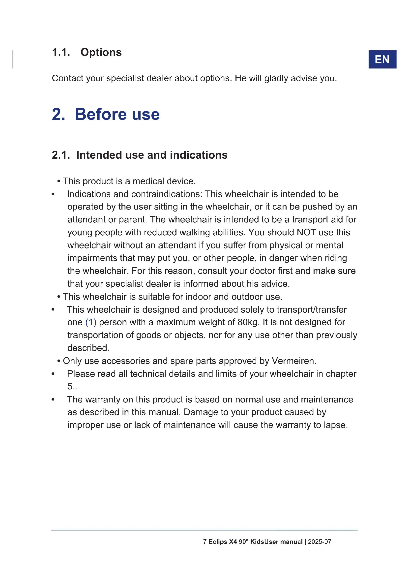 User manual For user and specialist dealer Installation instructions For specialist dealer Service manual for wheelchairs For specialist dealer EC declaration of conformity6User manual | 2025-07 Eclips X4 90° Kids