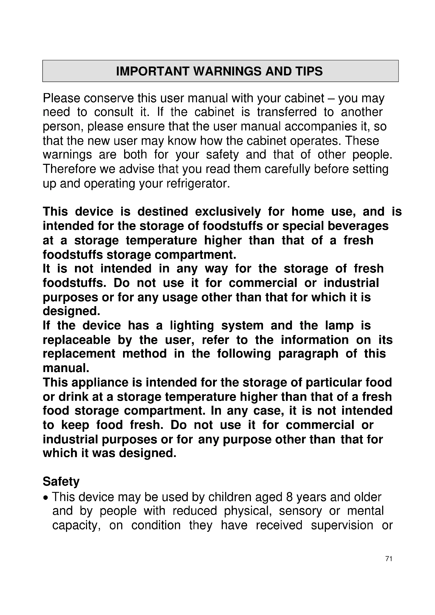 Please conserve this user manual with your cabinet – you may need to consult it. If the cabinet is transferred to another person, please ensure that the user manual accompanies it, so that the new user may know how the cabinet operates. These warnings are both for your safety and that of other people. Therefore we advise that you read them carefully before setting up and operating your refrigerator. This device is destined exclusively for home use, and is intended for the storage of foodstuffs or special beverages at a storage temperature higher than that of a fresh foodstuffs storage compartment. It is not intended in any way for the storage of fresh foodstuffs. Do not use it for commercial or industrial purposes or for any usage other than that for which it is designed. If the device has a lighting system and the lamp is replaceable by the user, refer to the information on its replacement method in the following paragraph of this manual. This appliance is intended for the storage of particular food or drink at a storage temperature higher than that of a fresh food storage compartment. In any case, it is not intended to keep food fresh. Do not use it for commercial or industrial purposes or for any purpose other than that for which it was designed. Safety This device may be used by children aged 8 years and older and by people with reduced physical, sensory or mental capacity, on condition they have received supervision or72 instruction concerning use of the device in all safety, and that they understand the risks. Children should not be allowed to play with the device. Children aged from 3 to 8 years are allowed to load and unload refrigerating appliances. Always disconnect the device's electricity supply before cleaning it; before defrosting it, before changing the illuminating lamp; before moving the device or before cleaning the floor underneath it. Cleaning and care by the user should not be done by children unless under supervision.