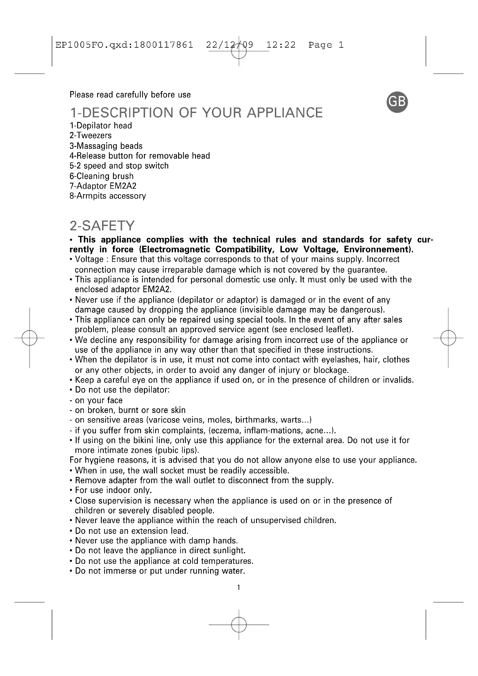 1-Depilator head 2-Tweezers 3-Massaging beads 4-Release button for removable head 5-2 speed and stop switch 6-Cleaning brush 7-Adaptor EM2A2 8-Armpits accessory EP1005FO.qxd:1800117861 22/12/09 12:22 Page 1• Do not use aggressive products or solvents for cleaning.