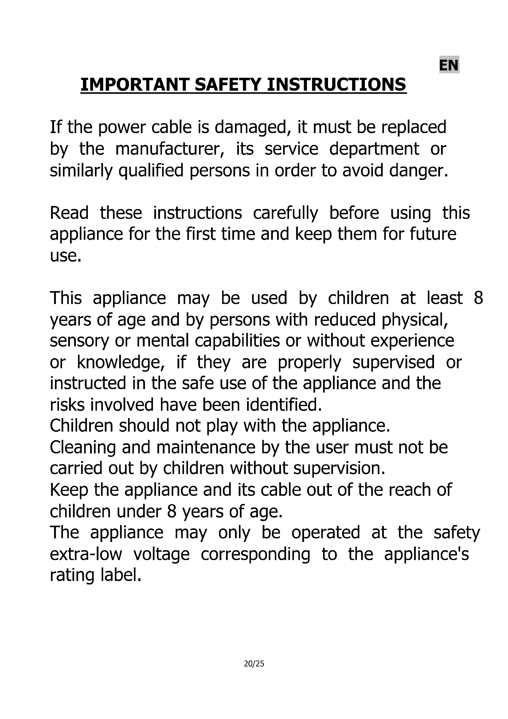 If the power cable is damaged, it must be replaced by the manufacturer, its service department or similarly qualified persons in order to avoid danger. Read these instructions carefully before using this appliance for the first time and keep them for future use. This appliance may be used by children at least 8 years of age and by persons with reduced physical, sensory or mental capabilities or without experience or knowledge, if they are properly supervised or instructed in the safe use of the appliance and the risks involved have been identified. Children should not play with the appliance. Cleaning and maintenance by the user must not be carried out by children without supervision. Keep the appliance and its cable out of the reach of children under 8 years of age. The appliance may only be operated at the safety extra-low voltage corresponding to the appliance's rating label.21/25