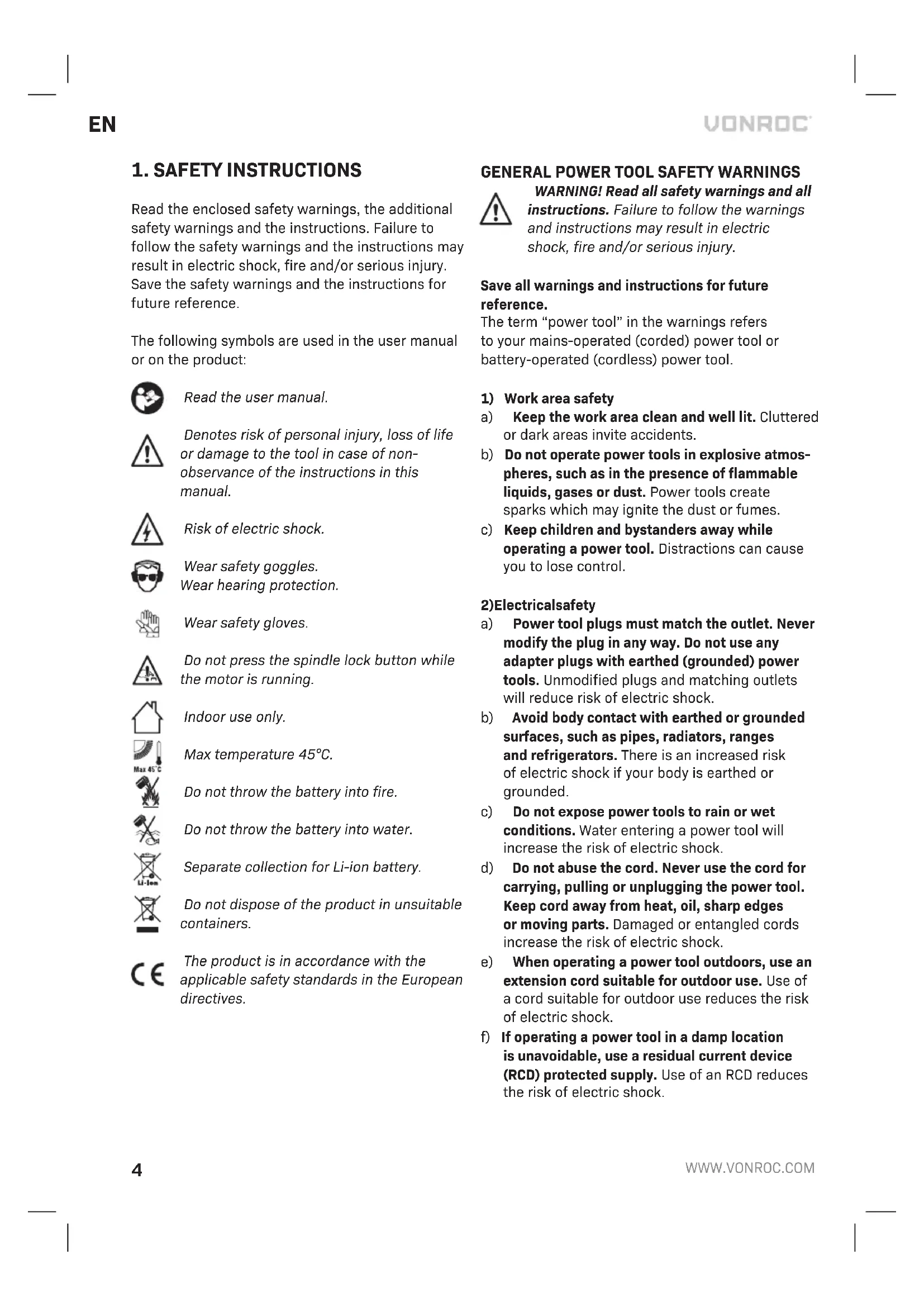 Before cleaning and maintenance, always switch off the machine and remove the battery pack from the machine. Clean the machine casings regularly with a soft cloth, preferably after each use. Make sure that the ventilation openings are free of dust and dirt. Remove very persistent dirt using a soft cloth moistened with soapsuds. Do not use any solvents such as gasoline, alcohol, ammonia, etc. Chemicals such as these will damage the synthetic components. WARRANTY VONROC products are developed to the highest quality standards and are guaranteed free of defects in both materials and workmanship for the period lawfully stipulated starting from the date of original purchase. Should the product develop any failure during this period due to defective material and/or workmanship then contact VONROC directly.DE