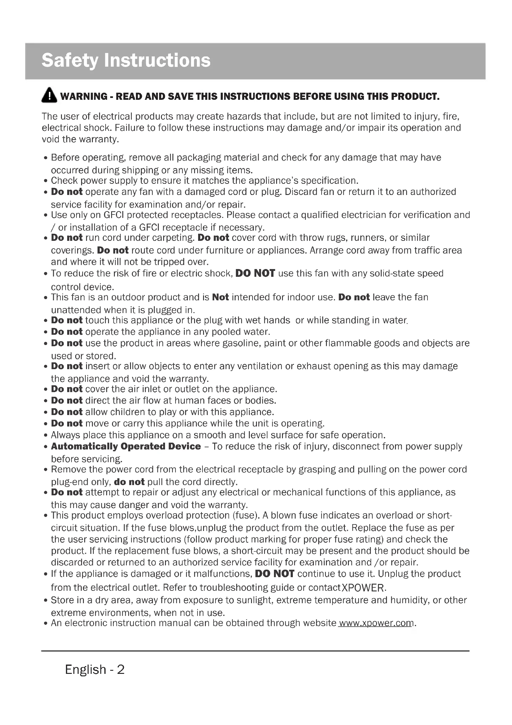 An electronic instruction manual can be obtained through website www.xpower.com.English - 3 Grounding Instructions This appliance must be grounded. In the event of malfunction or breakdown, grounding provides a path of least resistance for electric current to reduce the risk of electric shock. This appliance is equipped with a cord having an equipment-grounding conductor and a grounding plug. The plug must be plugged into an appropriate outlet that is properly installed and grounded in accordance with all local codes and ordinances. A qualified electrician should be consulted if there is any doubt as to whether an outlet box is properly grounded.