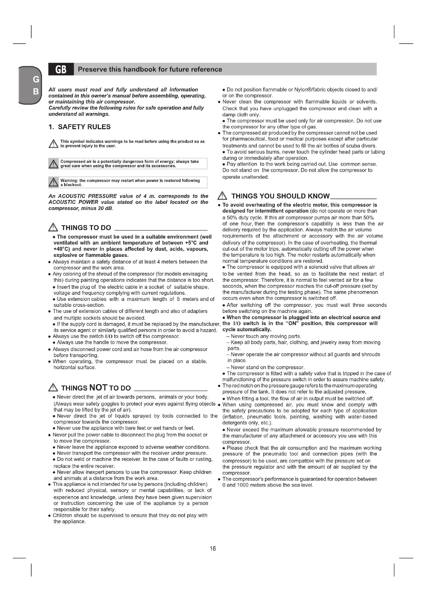 ● To avoid overheating of the electric motor, this compressor is designed for intermittent operation (do not operate on more than a 50% duty cycle. If this air compressor pumps air more than 50% of one hour, then the compressor’s capability is less than the air delivery required by the application. Always match the air volume requirements of the attachment or accessory with the air volume delivery of the compressor). In the case of overheating, the thermal cut-out of the motor trips, automatically cutting off the power when the temperature is too high. The motor restarts automatically when normal temperature conditions are restored. ● The compressor is equipped with a solenoid valve that allows air to be vented from the head, so as to facilitate the next restart of the compressor. Therefore, it is normal to feel vented air for a few seconds, when the compressor reaches the cut-off pressure (set by the manufacturer during the testing phase). The same phenomenon occurs even when the compressor is switched off. ● After switching off the compressor, you must wait three seconds before switching on the machine again. ● When the compressor is plugged into an electrical source and the I/O switch is in the “ON” position, this compressor will cycle automatically. – Never touch any moving parts. – Keep all body parts, hair, clothing, and jewelry away from moving parts. – Never operate the air compressor without all guards and shrouds in place. – Never stand on the compressor. ● The compressor is tted with a safety valve that is tripped in the case of malfunctioning of the pressure switch in order to assure machine safety. ● The red notch on the pressure gauge refers to the maximum operating pressure of the tank. It does not refer to the adjusted pressure. ● When tting a tool, the ow of air in output must be switched off. ● When using compressed air, you must know and comply with the safety precautions to be adopted for each type of application (ination, pneumatic tools, painting, washing with water-based detergents only, etc.). ● Never exceed the maximum allowable pressure recommended by the manufacturer of any attachment or accessory you use with this compressor. ● Please check that the air consumption and the maximum working pressure of the pneumatic tool and connection pipes (with the compressor) to be used, are compatible with the pressure set on the pressure regulator and with the amount of air supplied by the compressor. ● The compressor's performance is guaranteed for operation between 0 and 1000 meters above the sea level. Preserve this handbook for future reference GB17