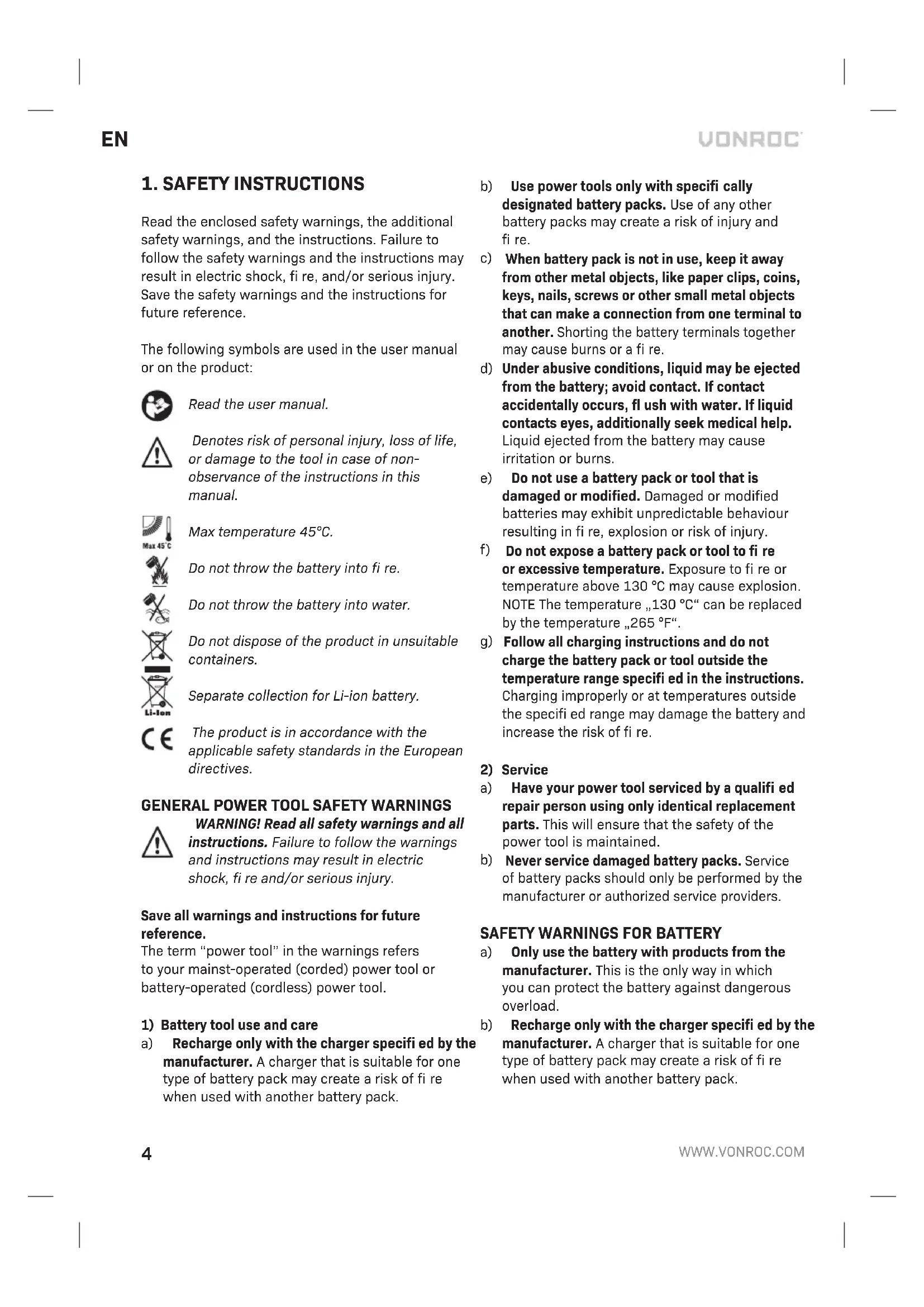 Before cleaning and maintenance, always switch off the machine and remove the battery pack from the machine. Clean the battery casings regularly with a soft cloth, preferably after each use. Make sure that the ventilation openings are free of dust and dirt. Remove very persistent dirt using a soft cloth moistened with soapsuds. Do not use any solvents such as gasoline, alcohol, ammonia, etc. Chemicals such as these will damage the synthetic components. ENVIRONMENT The crossed out wheelie bin symbol means that this product shall not be disposed of with normal household waste. Electronic and Electrical Equipment not included in the selective sorting process are potentially dangerous for the environment and human health due to the presence of hazardous substances. Please dispose of responsibly at an approved waste or recycling facility. Only for EC countries Do not dispose of power tools into domestic waste. According to the European Guideline 2012/19/ EC for Waste Electrical and Electronic Equipment and its implementation into inational right, power tools that are no longer usable must be collected separately and disposed of in an environmentally friendly way. WARRANTY VONROC products are developed to the highest quality standards and are guaranteed free of defects in both materials and workmanship for the period lawfully stipulated starting from the date of original purchase. Should the product develop any failure during this period due to defective material and/or workmanship then contact VONROC directly. The following circumstances are excluded from this guarantee: