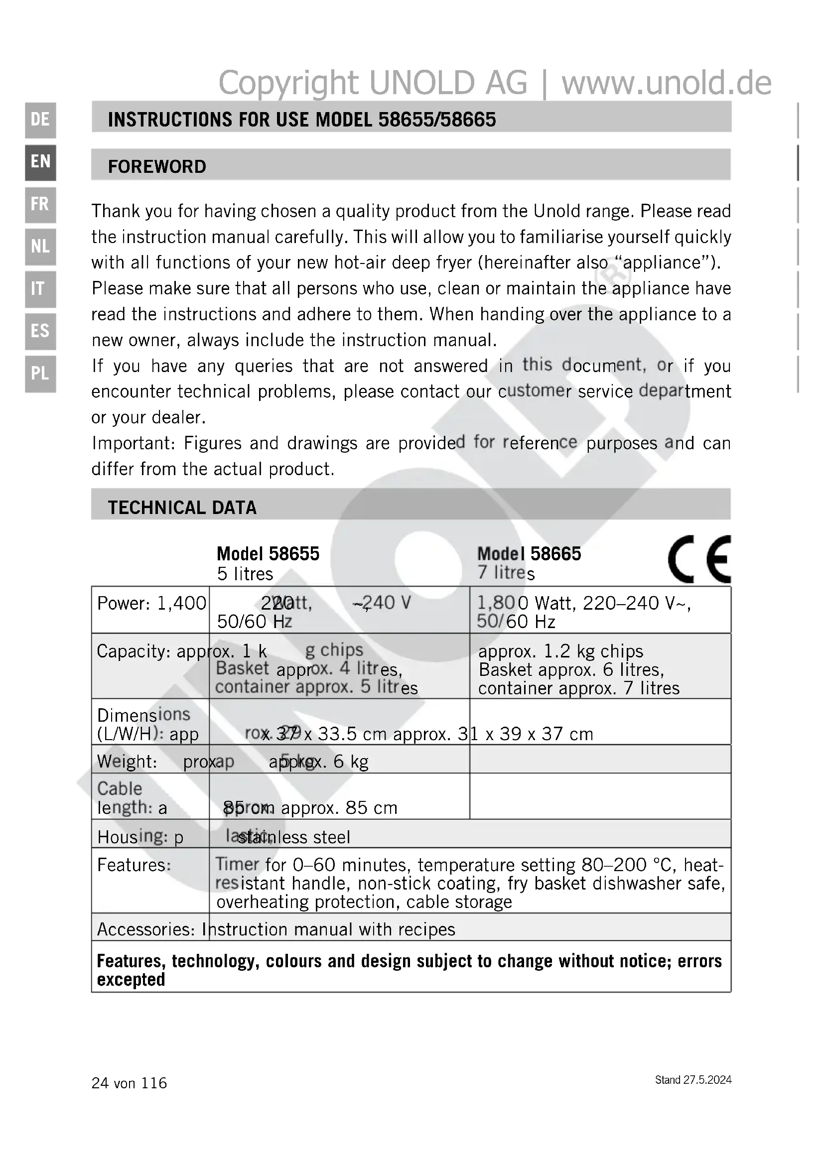 FOREWORD Thank you for having chosen a quality product from the Unold range. Please read the instruction manual carefully. This will allow you to familiarise yourself quickly with all functions of your new hot-air deep fryer (hereinafter also “appliance”). Please make sure that all persons who use, clean or maintain the appliance have read the instructions and adhere to them. When handing over the appliance to a new owner, always include the instruction manual. If you have any queries that are not answered in this document, or if you encounter technical problems, please contact our customer service department or your dealer. Important: Figures and drawings are provided for reference purposes and can differ from the actual product. TECHNICAL DATA Model 58655 5 litres Model 58665 7 litres Power: 1,400 Watt, 220–240 V~, 50/60 Hz 1,800 Watt, 220–240 V~, 50/60 Hz Capacity: approx. 1 kg chips Basket approx. 4 litres, container approx. 5 litres approx. 1.2 kg chips Basket approx. 6 litres, container approx. 7 litres Dimensions (L/W/H): approx. 29 x 37 x 33.5 cm approx. 31 x 39 x 37 cm Weight: approx. 5 kg approx. 6 kg Cable length: approx. 85 cm approx. 85 cm Housing: plastic, stainless steel Features: Timer for 0–60 minutes, temperature setting 80–200 °C, heat- resistant handle, non-stick coating, fry basket dishwasher safe, overheating protection, cable storage Accessories: Instruction manual with recipes Features, technology, colours and design subject to change without notice; errors excepted Copyright UNOLD AG | www.unold.deStand 27.5.2024 25 von 116