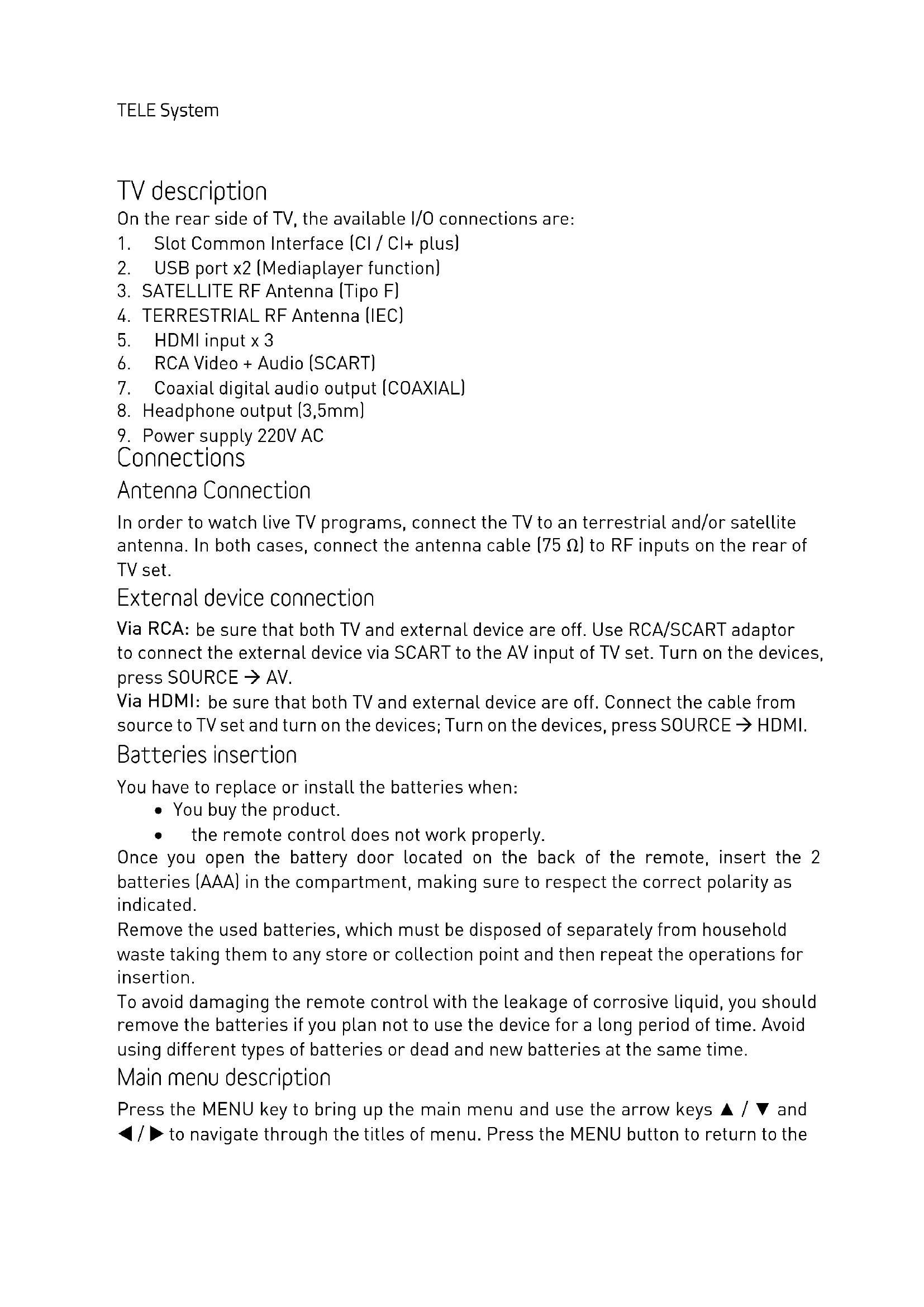Connections Antenna Connection In order to watch live TV programs, connect the TV to an terrestrial and/or satellite antenna. In both cases, connect the antenna cable (75 Ω) to RF inputs on the rear of TV set. External device connection Via RCA: be sure that both TV and external device are off. Use RCA/SCART adaptor to connect the external device via SCART to the AV input of TV set. Turn on the devices, press SOURCE à AV. Via HDMI: be sure that both TV and external device are off. Connect the cable from source to TV set and turn on the devices; Turn on the devices, press SOURCE à HDMI. Batteries insertion You have to replace or install the batteries when: