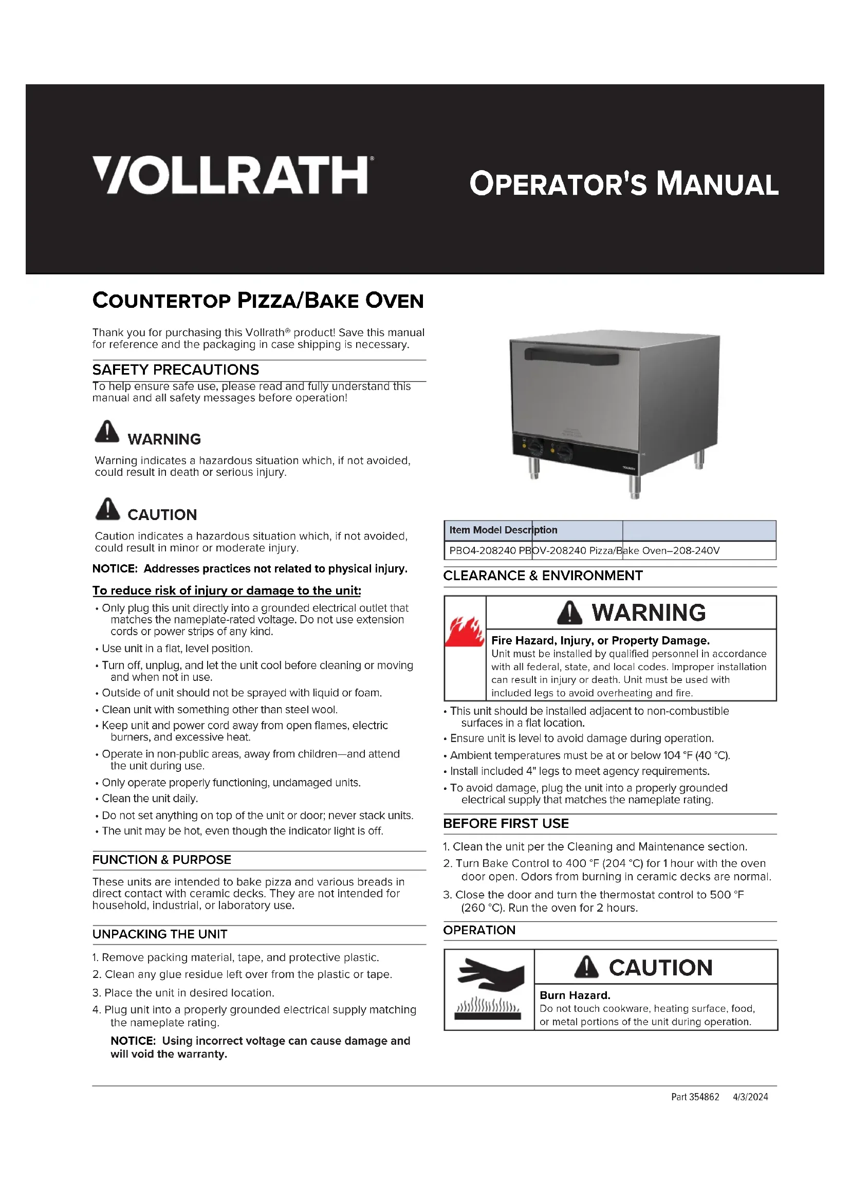 PBO4208240 - Pizza oven Vollrath - Free user manual and instructions
