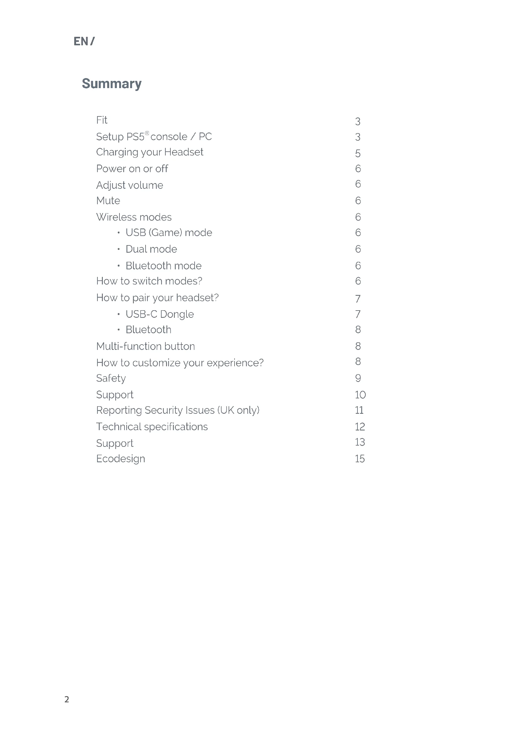 - Wireless USB Dongle: The Headset and wireless USB Dongle are already paired out of the box. If you need to do a new pairing, for any reason, make sure: - The USB-A wireless dongle is connected to your console or PC, - Turn off the Headset. Press and hold the power On/Off button for more than 6s until to hear the Prompt voice: “Pairing USB”. The Headset LED will flash Purple during the pairing process. When pairing is successful you will hear the prompt voice: - “Connected” in USB mode; or - “USB connected” in Dual mode If pairing is unsuccessful, you will hear the prompt voice: “USB Pairing Failed”. In this case repeat the pairing process again making sure the above conditions are followed.EN /