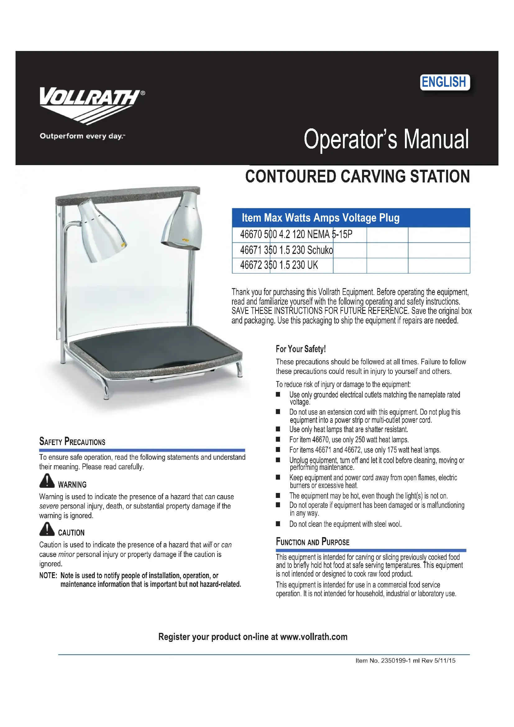 46671 350 1.5 230 Schuko 46672 350 1.5 230 UK Register your product on-line at www.vollrath.com Safety PrecautionS To ensure safe operation, read the following statements and understand their meaning. Please read carefully. WARNINGWarning is used to indicate the presence of a hazard that can cause severe personal injury, death, or substantial property damage if the warning is ignored. CAUTIONCaution is used to indicate the presence of a hazard that will or can cause minor personal injury or property damage if the caution is ignored.NOTE: Note is used to notify people of installation, operation, or maintenance information that is important but not hazard-related. For Your Safety! These precautions should be followed at all times. Failure to follow these precautions could result in injury to yourself and others.To reduce risk of injury or damage to the equipment: Use only grounded electrical outlets matching the nameplate rated voltage. Do not use an extension cord with this equipment. Do not plug this equipment into a power strip or multi-outlet power cord. Use only heat lamps that are shatter resistant. For item 46670, use only 250 watt heat lamps. For items 46671 and 46672, use only 175 watt heat lamps. Unplug equipment, turn off and let it cool before cleaning, moving or performing maintenance. Keep equipment and power cord away from open ames, electric burners or excessive heat. The equipment may be hot, even though the light(s) is not on. Do not operate if equipment has been damaged or is malfunctioning in any way. Do not clean the equipment with steel wool. function and PurPoSe This equipment is intended for carving or slicing previously cooked food and to briey hold hot food at safe serving temperatures. This equipment is not intended or designed to cook raw food product.This equipment is intended for use in a commercial food service operation. It is not intended for household, industrial or laboratory use. CONTOURED CARVING STATIONOperatOr’s Manual
