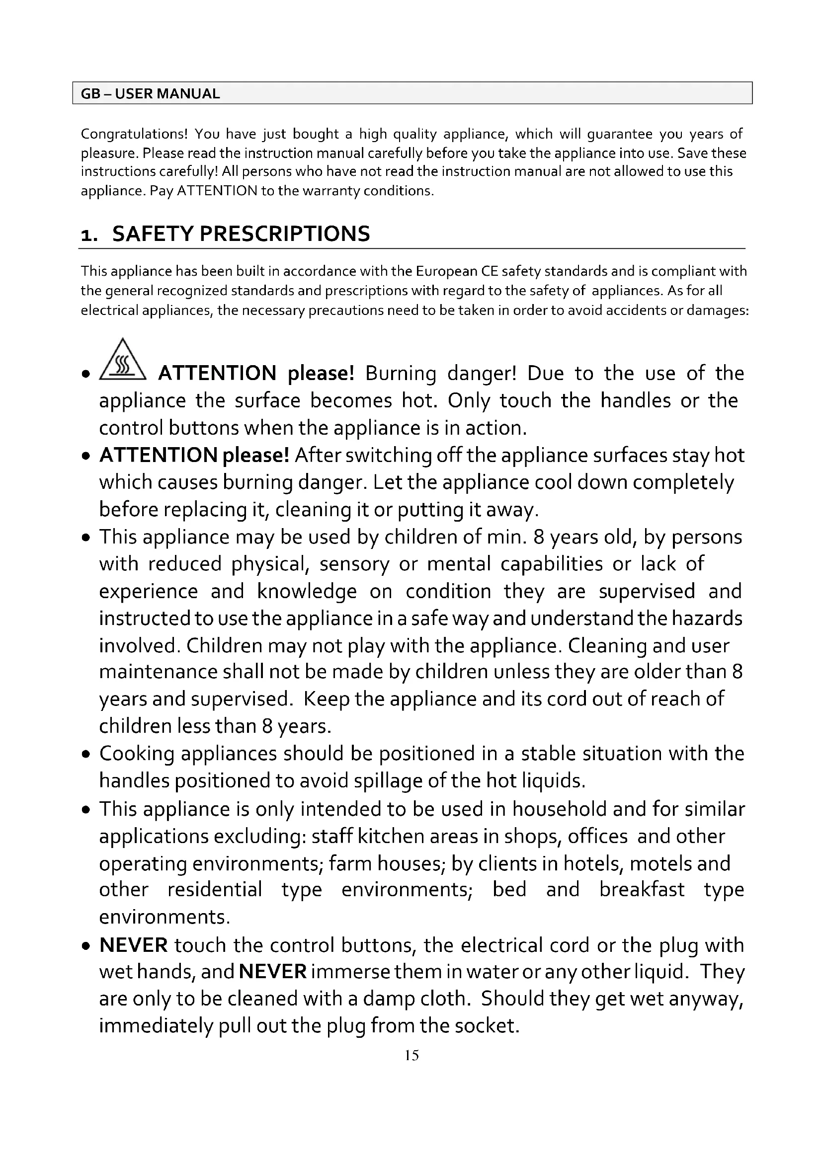 - ATTENTION please! Burning danger! Due to the use of the appliance the surface becomes hot. Only touch the handles or the control buttons when the appliance is in action.