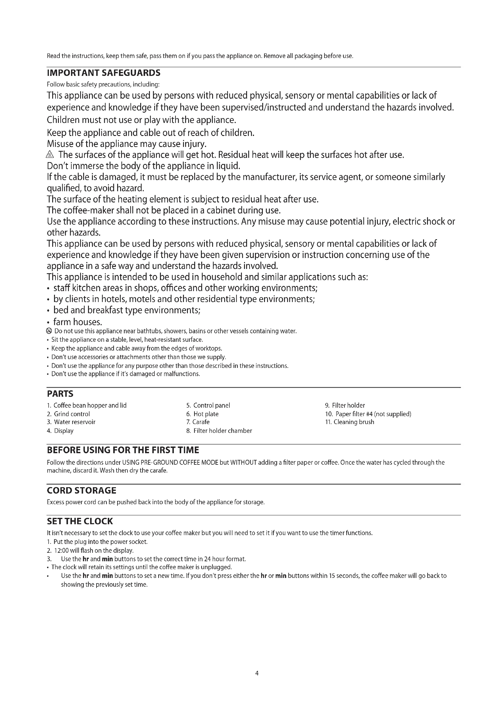 AE4 Read the instructions, keep them safe, pass them on if you pass the appliance on. Remove all packaging before use. IMPORTANT SAFEGUARDS Follow basic safety precautions, including: This appliance can be used by persons with reduced physical, sensory or mental capabilities or lack of experience and knowledge if they have been supervised/instructed and understand the hazards involved. Children must not use or play with the appliance. Keep the appliance and cable out of reach of children. Misuse of the appliance may cause injury. h The surfaces of the appliance will get hot. Residual heat will keep the surfaces hot after use. Don’t immerse the body of the appliance in liquid. If the cable is damaged, it must be replaced by the manufacturer, its service agent, or someone similarly qualied, to avoid hazard. The surface of the heating element is subject to residual heat after use. The coee-maker shall not be placed in a cabinet during use. Use the appliance according to these instructions. Any misuse may cause potential injury, electric shock or other hazards. This appliance can be used by persons with reduced physical, sensory or mental capabilities or lack of experience and knowledge if they have been given supervision or instruction concerning use of the appliance in a safe way and understand the hazards involved. This appliance is intended to be used in household and similar applications such as: