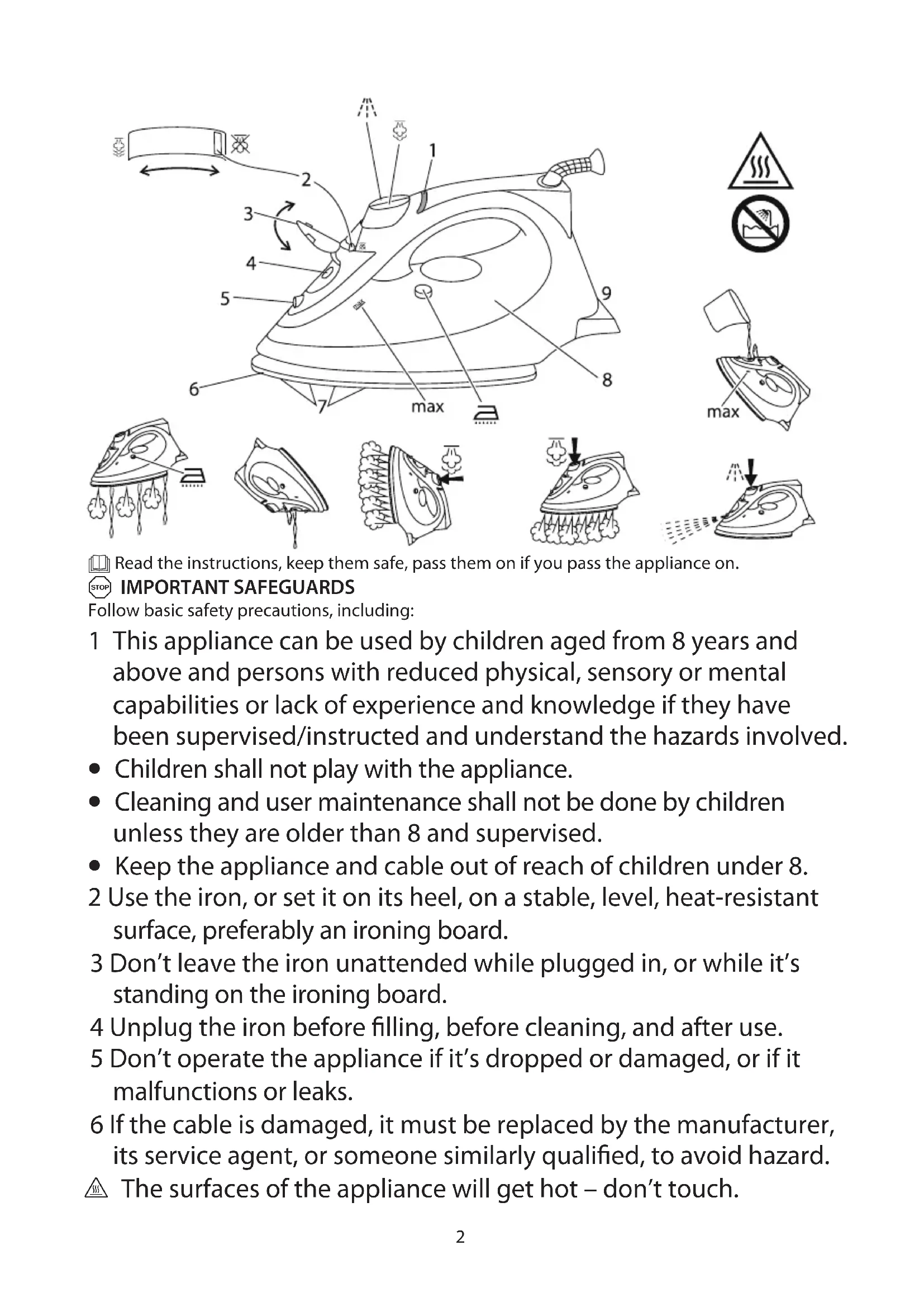 - Keep the appliance and cable out of reach of children under 8. 2 Use the iron, or set it on its heel, on a stable, level, heat-resistant surface, preferably an ironing board. 3 Don’t leave the iron unattended while plugged in, or while it’s standing on the ironing board. 4 Unplug the iron before filling, before cleaning, and after use. 5 Don’t operate the appliance if it’s dropped or damaged, or if it malfunctions or leaks. 6 If the cable is damaged, it must be replaced by the manufacturer, its service agent, or someone similarly qualified, to avoid hazard. h The surfaces of the appliance will get hot – don’t touch.3