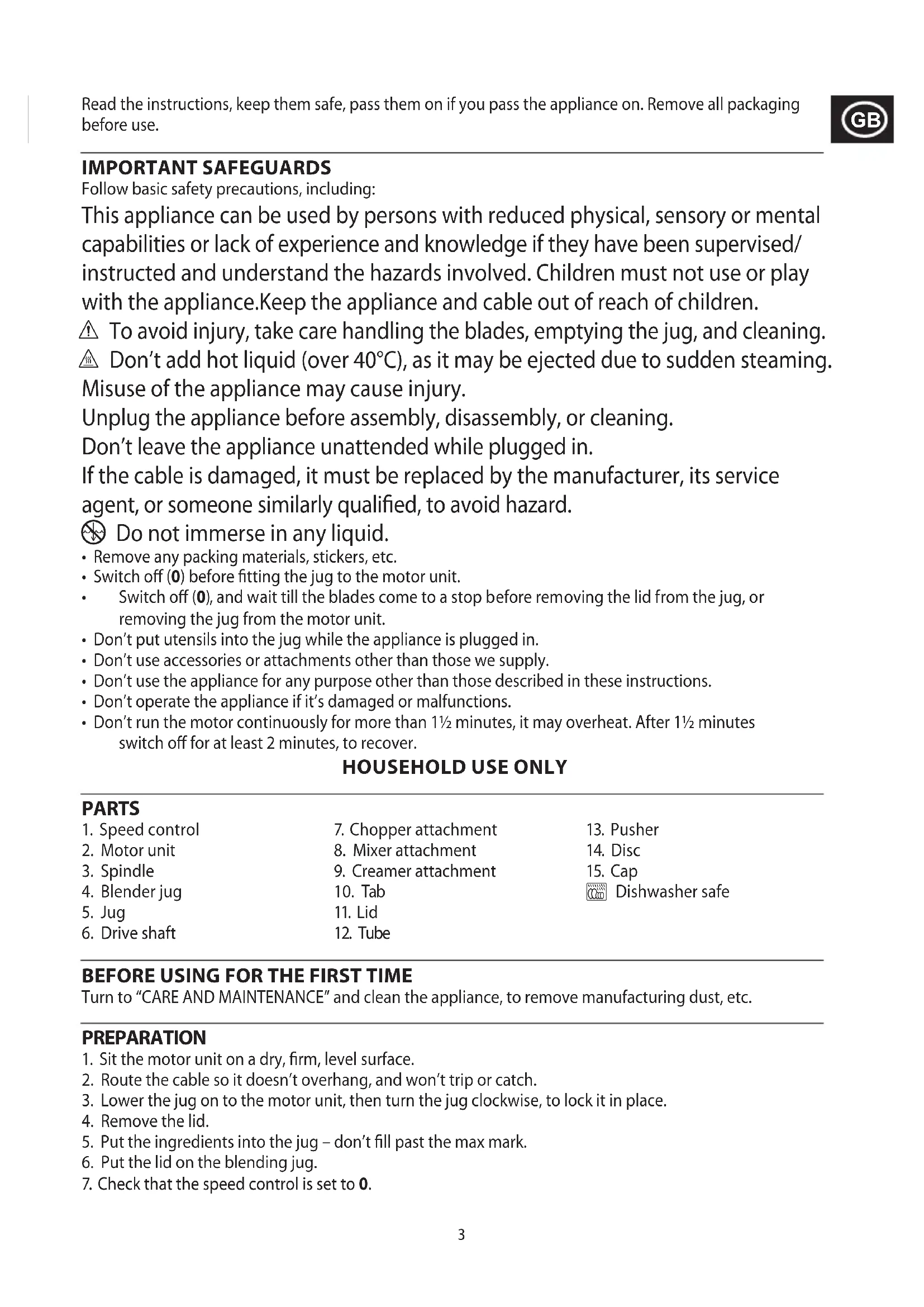 MAX MAX aa3 Read the instructions, keep them safe, pass them on if you pass the appliance on. Remove all packaging before use. IMPORTANT SAFEGUARDS Follow basic safety precautions, including: This appliance can be used by persons with reduced physical, sensory or mental capabilities or lack of experience and knowledge if they have been supervised/ instructed and understand the hazards involved. Children must not use or play with the appliance.Keep the appliance and cable out of reach of children. c To avoid injury, take care handling the blades, emptying the jug, and cleaning. h Don’t add hot liquid (over 40°C), as it may be ejected due to sudden steaming. Misuse of the appliance may cause injury. Unplug the appliance before assembly, disassembly, or cleaning. Don’t leave the appliance unattended while plugged in. If the cable is damaged, it must be replaced by the manufacturer, its service agent, or someone similarly qualified, to avoid hazard.