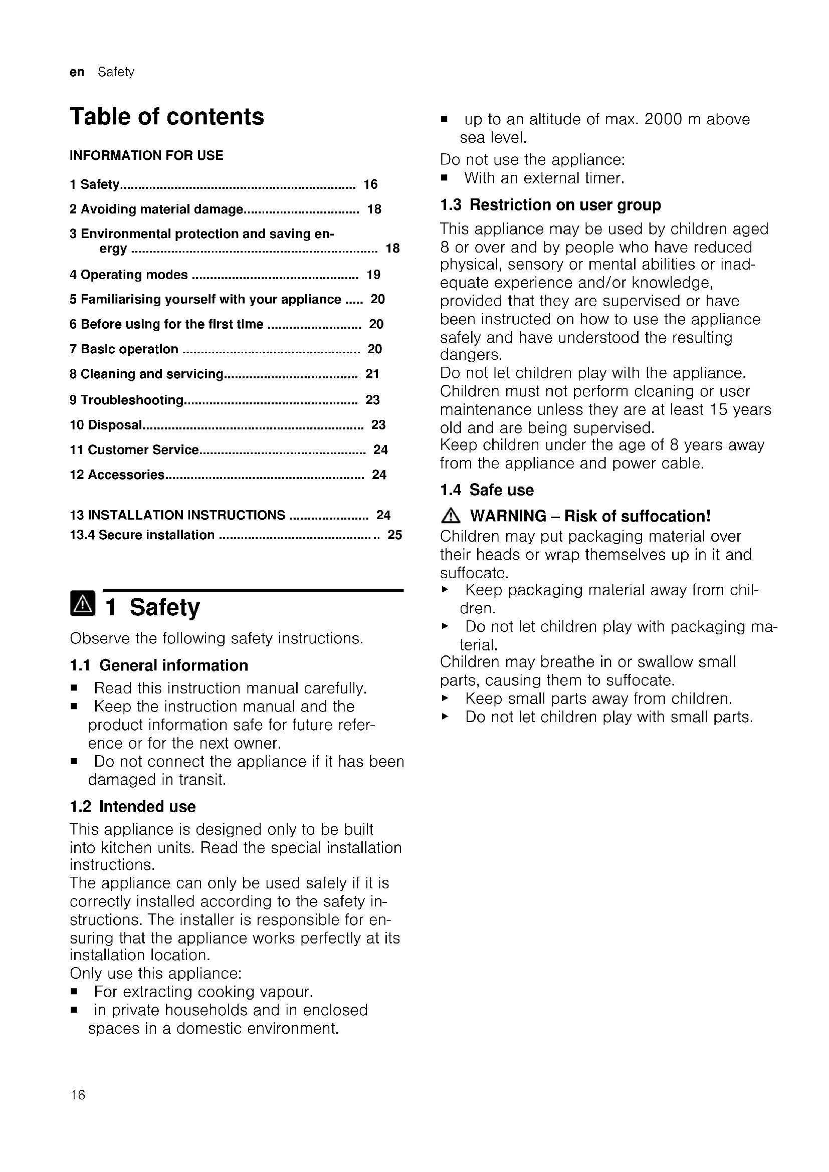1 Safety Observe the following safety instructions. 1.1 General information ¡ Read this instruction manual carefully. ¡ Keep the instruction manual and the product information safe for future refer- ence or for the next owner. ¡ Do not connect the appliance if it has been damaged in transit. 1.2 Intended use This appliance is designed only to be built into kitchen units. Read the special installation instructions. The appliance can only be used safely if it is correctly installed according to the safety in- structions. The installer is responsible for en- suring that the appliance works perfectly at its installation location. Only use this appliance: ¡ For extracting cooking vapour. ¡ in private households and in enclosed spaces in a domestic environment. ¡ up to an altitude of max. 2000m above sea level. Do not use the appliance: ¡ With an external timer. 1.3 Restriction on user group This appliance may be used by children aged 8 or over and by people who have reduced physical, sensory or mental abilities or inad- equate experience and/or knowledge, provided that they are supervised or have been instructed on how to use the appliance safely and have understood the resulting dangers. Do not let children play with the appliance. Children must not perform cleaning or user maintenance unless they are at least 15 years old and are being supervised. Keep children under the age of 8 years away from the appliance and power cable. 1.4 Safe use WARNING‒Risk of suffocation! Children may put packaging material over their heads or wrap themselves up in it and suffocate. ▶ Keep packaging material away from chil- dren. ▶ Do not let children play with packaging ma- terial. Children may breathe in or swallow small parts, causing them to suffocate. ▶ Keep small parts away from children. ▶ Do not let children play with small parts.Safety en