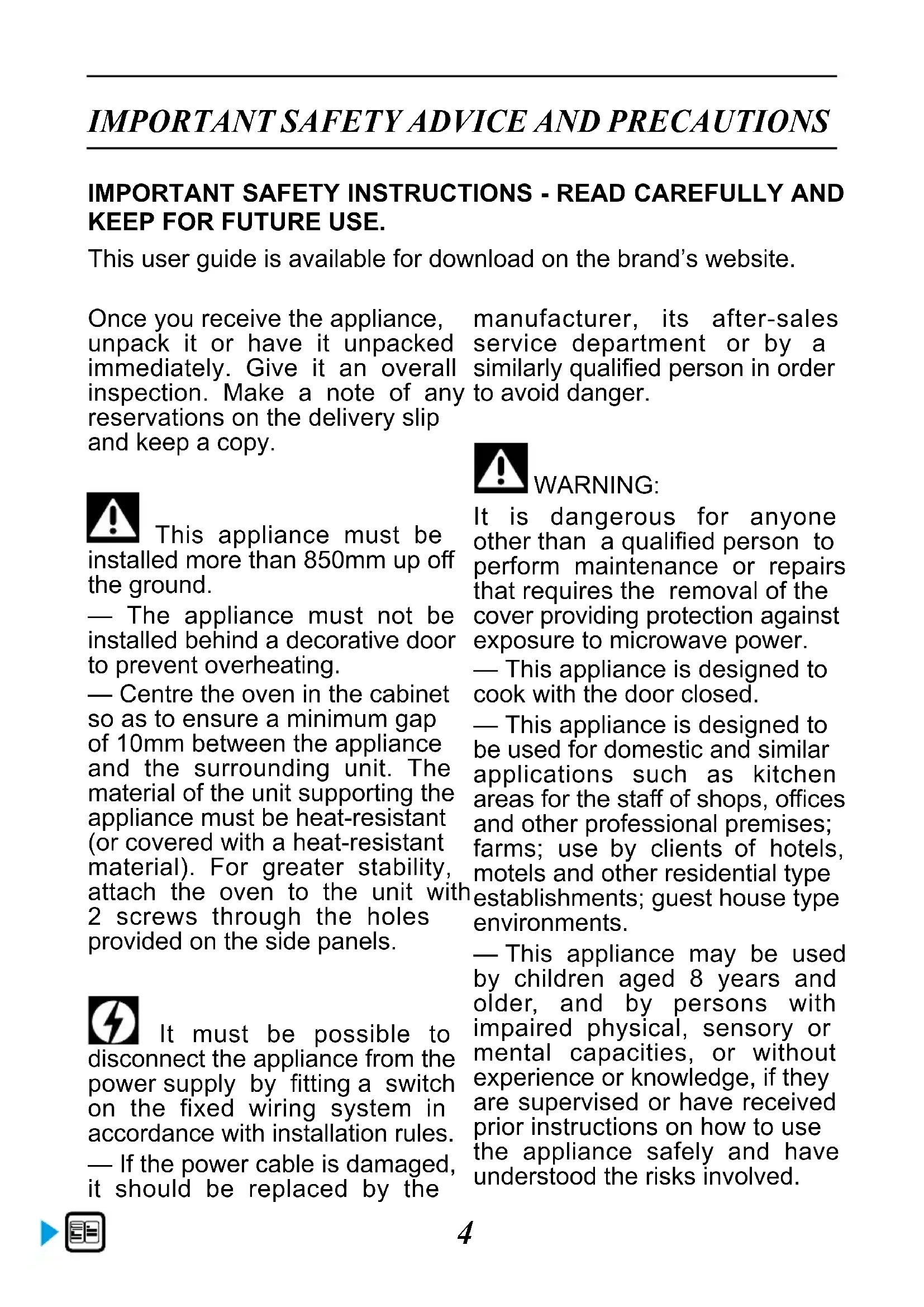 It is dangerous for anyone other than a qualied person to perform maintenance or repairs that requires the removal of the cover providing protection against exposure to microwave power. — This appliance is designed to cook with the door closed. — This appliance is designed to be used for domestic and similar applications such as kitchen areas for the sta of shops, oces and other professional premises; farms; use by clients of hotels, motels and other residential type establishments; guest house type environments. — This appliance may be used by children aged 8 years and older, and by persons with impaired physical, sensory or mental capacities, or without experience or knowledge, if they are supervised or have received prior instructions on how to use the appliance safely and have understood the risks involved. IMPORTANT SAFETY INSTRUCTIONS - READ CAREFULLY AND KEEP FOR FUTURE USE. This user guide is available for download on the brand’s website.5
