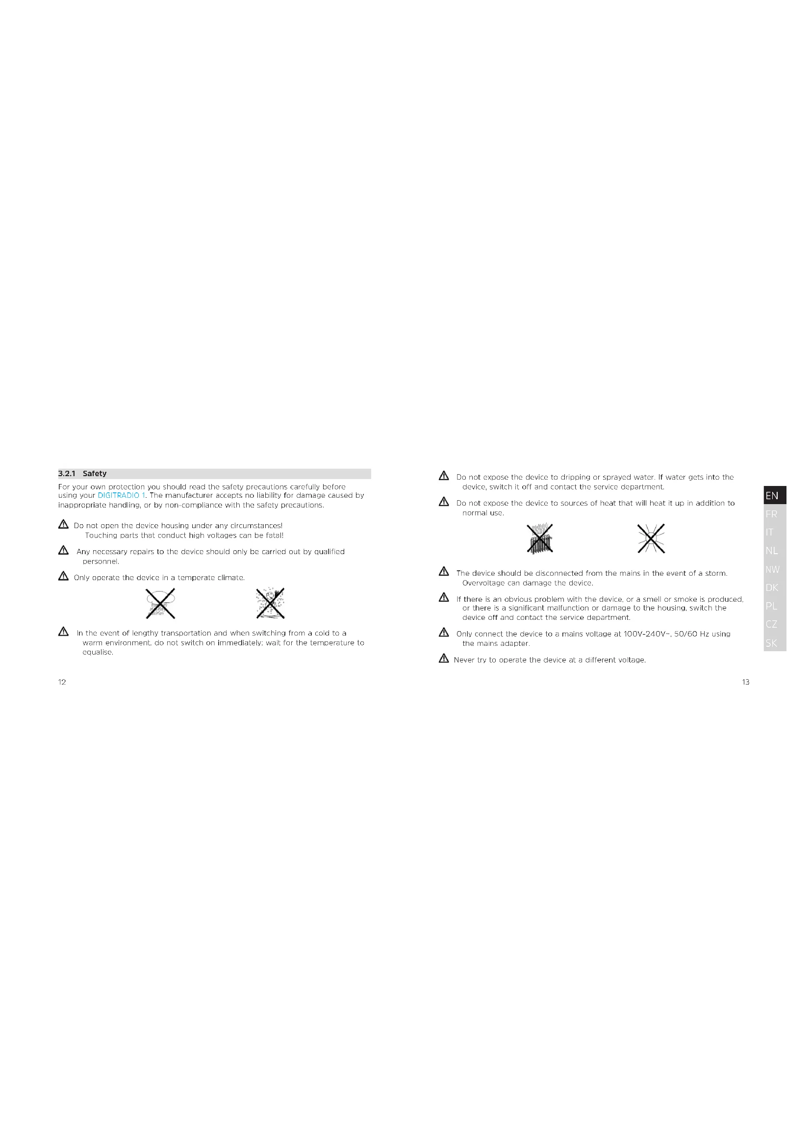 For your own protection you should read the safety precautions carefully before using your DIGITRADIO 1. The manufacturer accepts no liability for damage caused by inappropriate handling, or by non-compliance with the safety precautions. Do not open the device housing under any circumstances! Touching parts that conduct high voltages can be fatal! Any necessary repairs to the device should only be carried out by qualified personnel. Only operate the device in a temperate climate. In the event of lengthy transportation and when switching from a cold to a warm environment, do not switch on immediately; wait for the temperature to equalise. Do not expose the device to dripping or sprayed water. If water gets into the device, switch it off and contact the service department. Do not expose the device to sources of heat that will heat it up in addition to normal use. The device should be disconnected from the mains in the event of a storm. Overvoltage can damage the device. If there is an obvious problem with the device, or a smell or smoke is produced, or there is a significant malfunction or damage to the housing, switch the device off and contact the service department. Only connect the device to a mains voltage at 100V-240V~, 50/60 Hz using the mains adapter. Never try to operate the device at a different voltage. BDA DigitRadio 1.indd 12-13 16/04/2018 16:4114