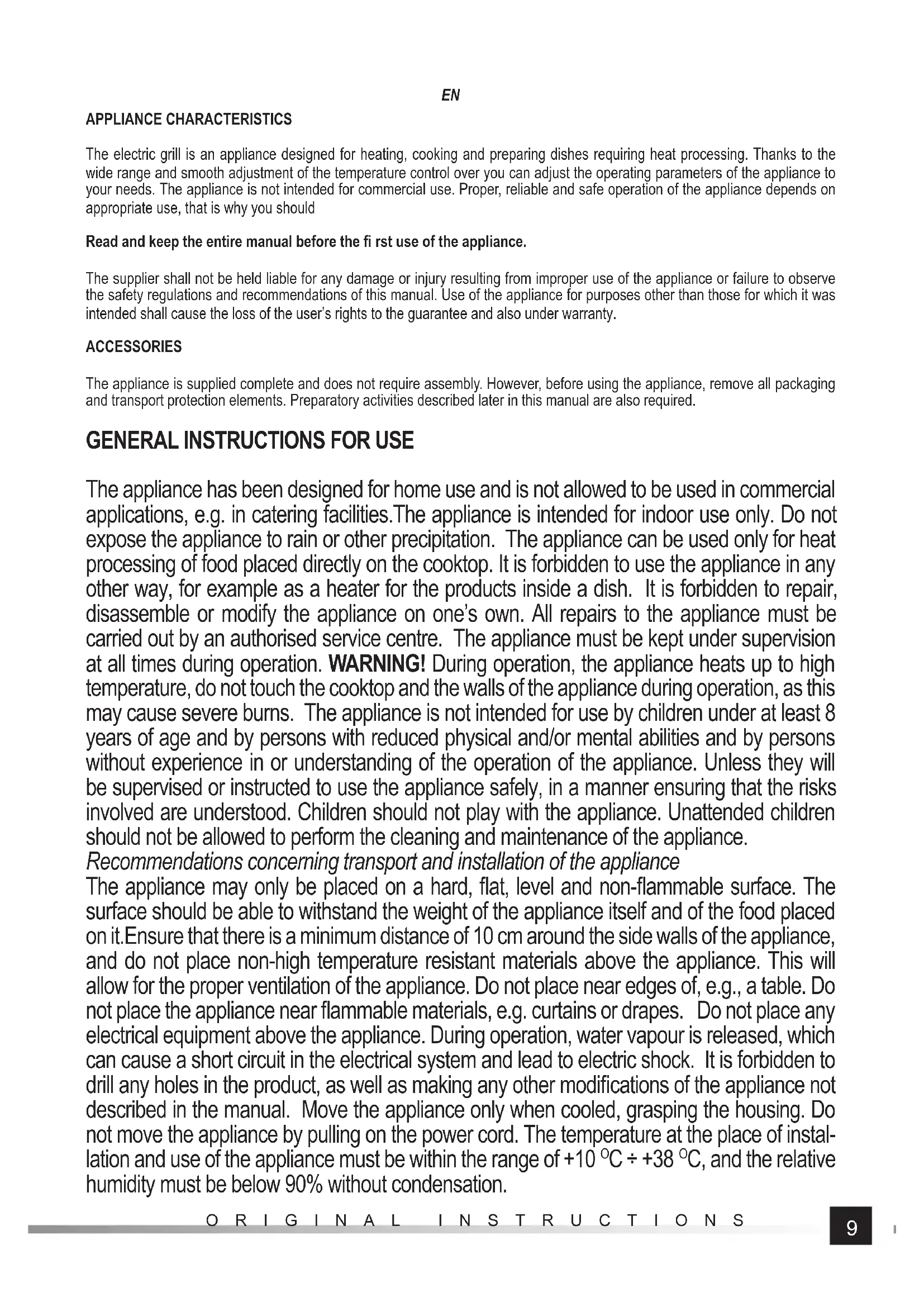 ORIGINAL INSTRUCTIONS APPLIANCE CHARACTERISTICS The electric grill is an appliance designed for heating, cooking and preparing dishes requiring heat processing. Thanks to the wide range and smooth adjustment of the temperature control over you can adjust the operating parameters of the appliance to your needs. The appliance is not intended for commercial use. Proper, reliable and safe operation of the appliance depends on appropriate use, that is why you should Read and keep the entire manual before the fi rst use of the appliance. The supplier shall not be held liable for any damage or injury resulting from improper use of the appliance or failure to observe the safety regulations and recommendations of this manual. Use of the appliance for purposes other than those for which it was intended shall cause the loss of the user’s rights to the guarantee and also under warranty. ACCESSORIES The appliance is supplied complete and does not require assembly. However, before using the appliance, remove all packaging and transport protection elements. Preparatory activities described later in this manual are also required.